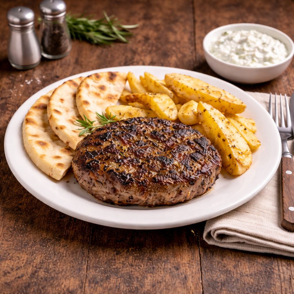 Šťavnatá masová placka z mletého masa, typická pro řeckou kuchyni. Často se označuje jako řecký burger, ale na rozdíl od klasiky se nepodává v bulce – jde o plnohodnotné jídlo s přílohou. Chuť stojí na bylinkách a koření, které masu dávají charakter řeckých taveren.