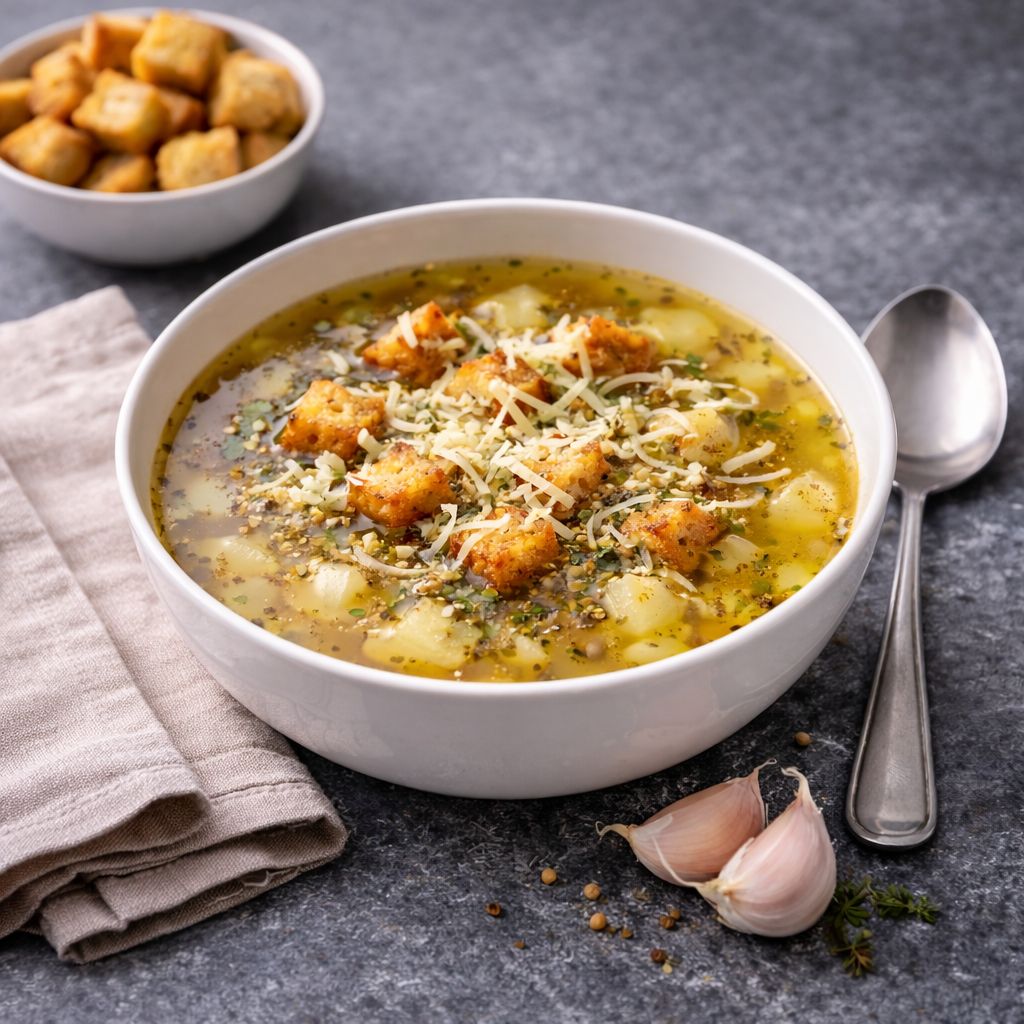 Tento recept na česnekovou se sýrem a opečenými krutony je jednoduchý, sytý a vychází z tradiční české kuchyně.