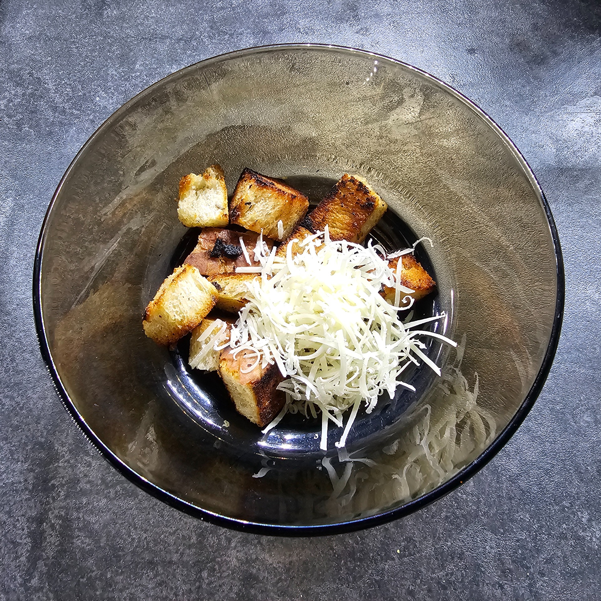Chléb nakrájejte na malé kostky a opečte ho na pánvi na troše másla nebo oleje, dokud nebude zlatavý a křupavý.