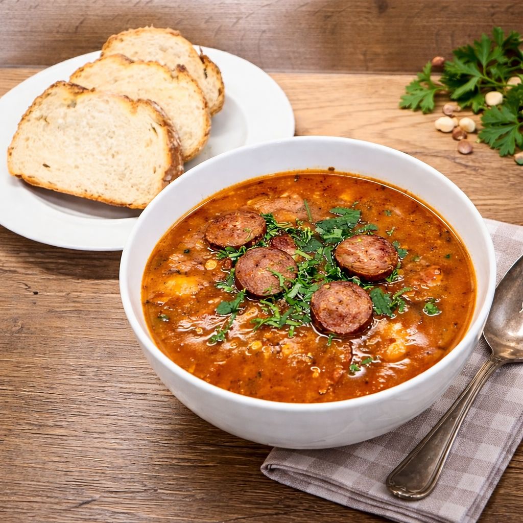 Fazolová polévka s klobásou je hustá, sytá a plná výrazné chuti. Stojí na dobrém základu z cibule, koření a kvalitní klobásy, která jí dodá sílu. Není to lehká polévka – ale přesně taková, po které máš pocit, že ses najedl.