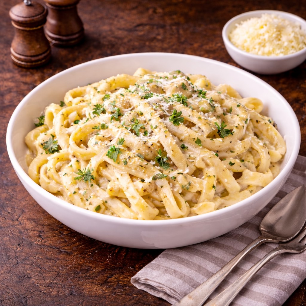 Fettuccine Alfredo je jednoduchý italský recept, který stojí na dokonalém propojení másla, sýra a škrobu z těstovin. Správně připravené těstoviny nejsou mastné ani suché, ale mají jemnou, krémovou omáčku bez použití smetany.