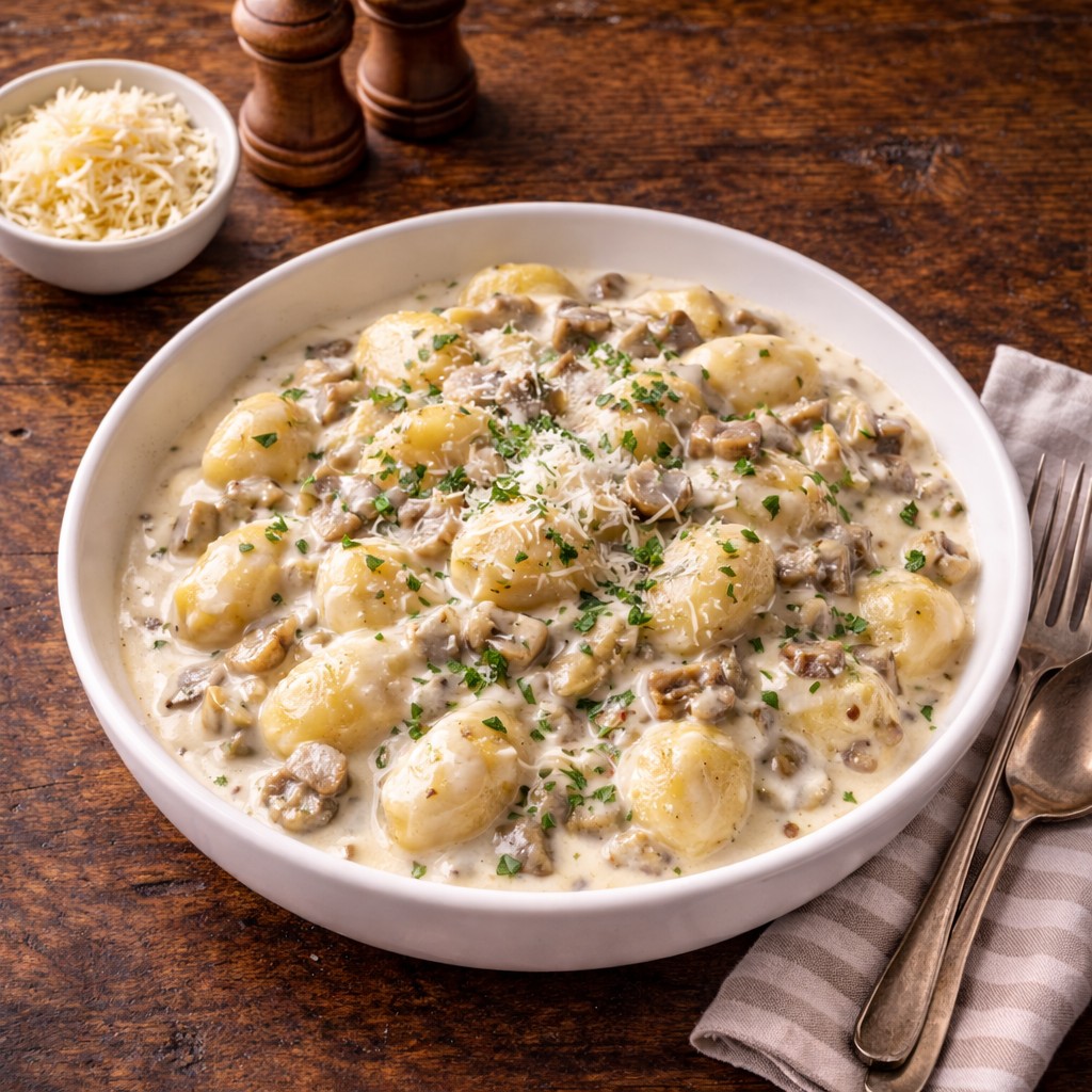 Gnocchi ve smetanové omáčce s houbami a sýrem jsou rychlé a syté jídlo, které kombinuje jemnou krémovou omáčku, opečené žampiony a výraznou chuť sýra. Díky jednoduché přípravě jde o ideální volbu na oběd i večeři, která zasytí a zároveň nezabere moc času.