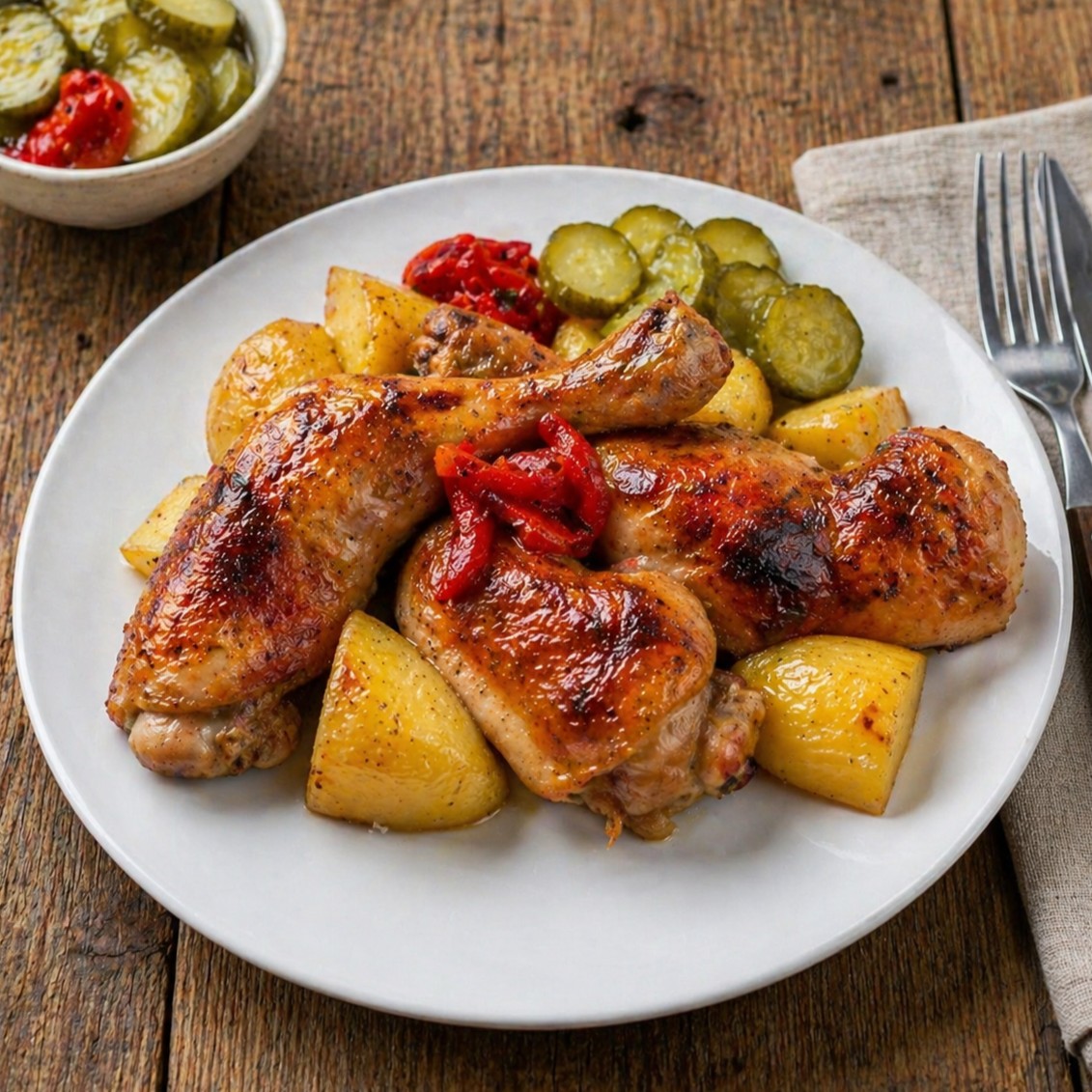 Jednoduché jídlo, kde se v jedné nádobě spojí kuřecí špalíky, brambory, cibule a slanina. Vše se peče společně, takže brambory nasáknou výpek a kuře zůstane šťavnaté s křupavou kůží.