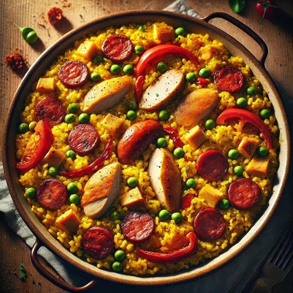 Paella s kuřecím masem je varianta slavného španělského jídla původem z Valencie, které se připravuje na široké pánvi. Používají se kousky kuřecího masa, které se dusí s rýží, zeleninou, rajčaty a typickým kořením jako je šafrán nebo uzená paprika. Použijte kořenící směs Paella. Výsledkem je syté, voňavé a barevné jídlo s typicky španělským charakterem.