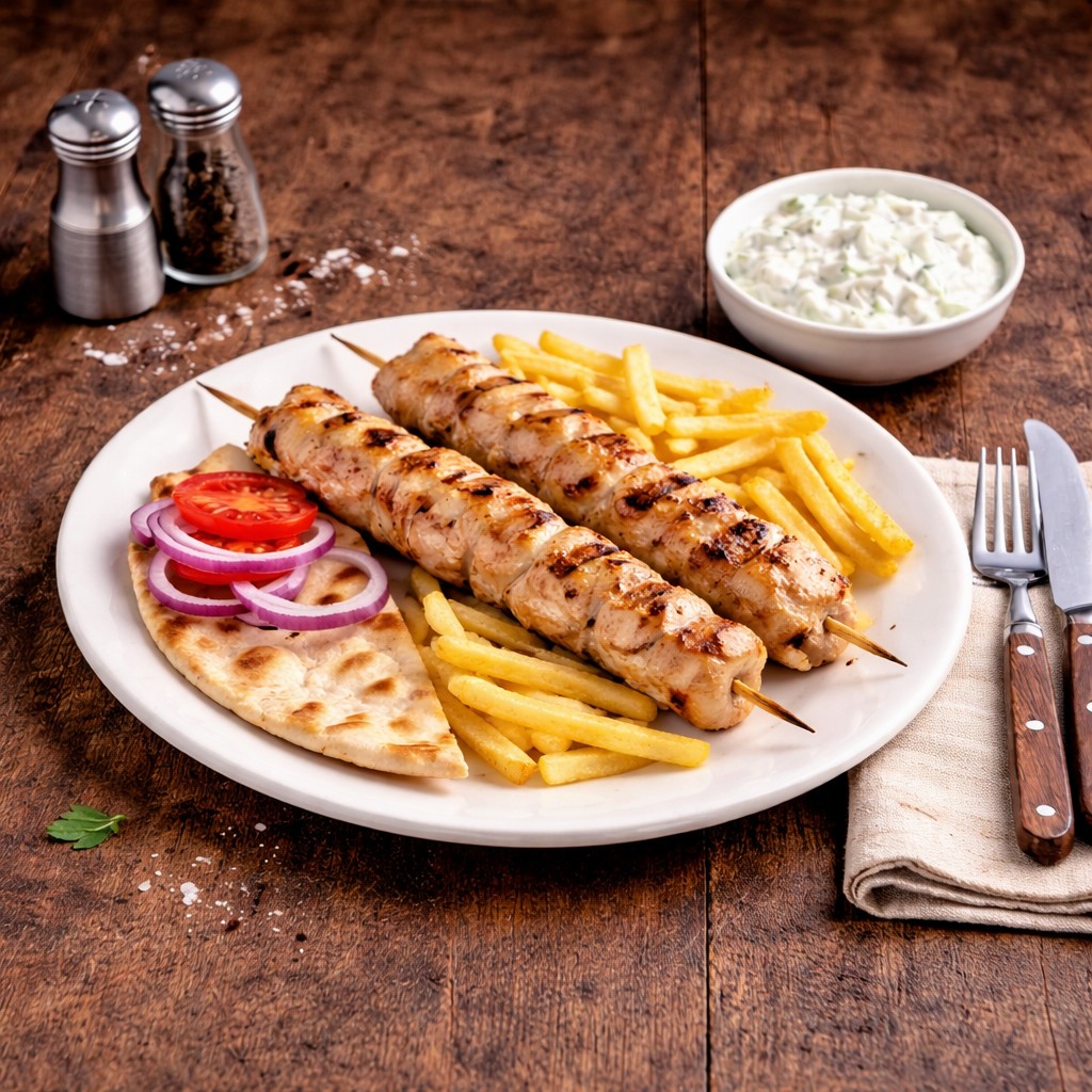 Řecká kuchyně stojí na jednoduchém principu – kvalitní maso, základní suroviny a výrazné koření. Nejčastěji se používá vepřové nebo kuřecí maso, doplněné bylinkami, česnekem a olivovým olejem.