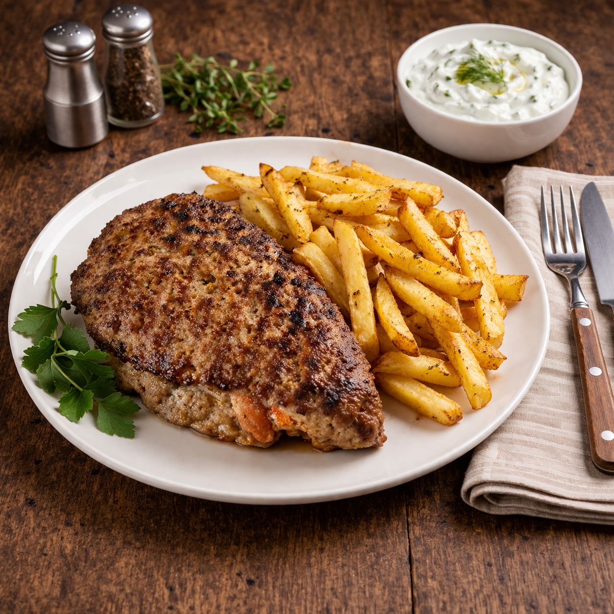 Jedno z nejznámějších řeckých jídel z mletého masa, které se připravuje jako větší, hutná placka bez náplně. Díky výraznému koření a bylinkám má typickou chuť, kterou znáš z řeckých taveren.