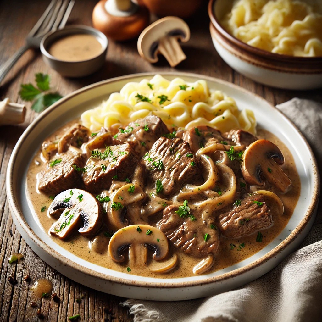 Stroganoff kuřecí je lehčí verzí slavného ruského pokrmu Bœuf Stroganoff, který vznikl v 19. století na dvoře bohaté šlechtické rodiny Stroganovových. Místo hovězího masa se používá kuřecí, které se dusí v omáčce z cibule, smetany, hořčice a někdy i žampionů. Tahle úprava si zachovává krémovou chuť a jemnost, ale je rychlá pro každodenní vaření.