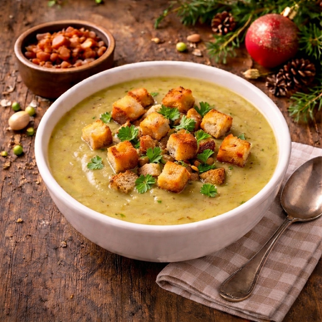 Vánoční hrachová polévka je hustá, sytá a poctivá. Není to lehká polévka na zahřátí, ale plnohodnotné jídlo, které stojí na chuti hrachu, česneku a majoránky. Když se udělá správně, je krémová, výrazná a zasytí na dlouho.