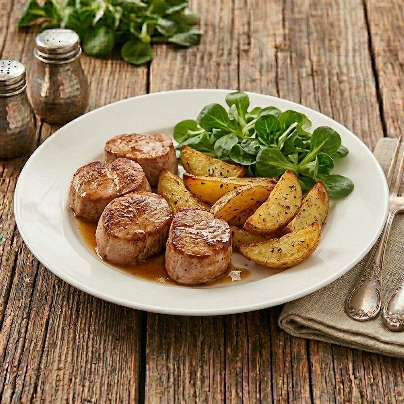 Šťavnatá vepřová panenka připravená jako rychlá minutka a k tomu v troubě dozlatova opečené brambory s tymiánem. Jídlo, které stojí na správném načasování – když ho trefíš, dostaneš maso měkké, šťavnaté a plné chuti.