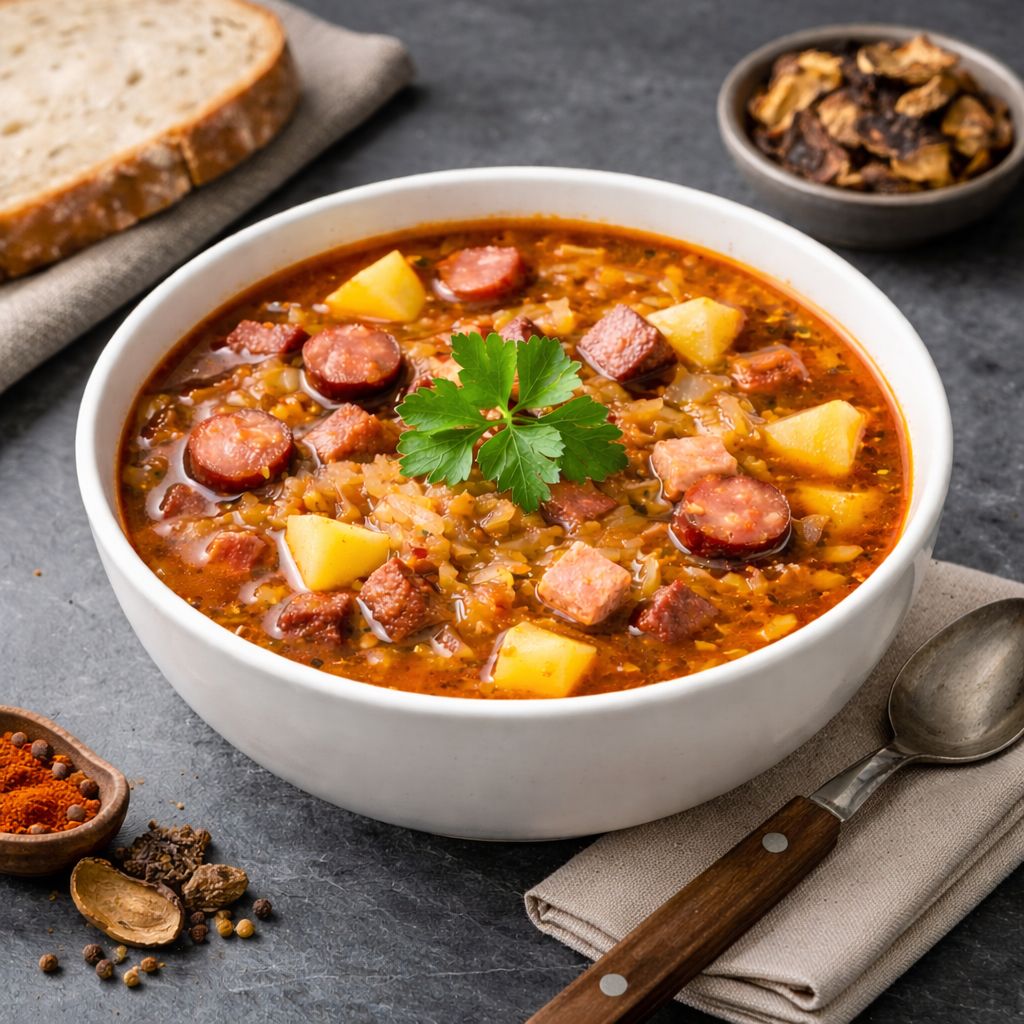 Poctivá domácí zelňačka s uzeným masem, klobásou a houbami patří mezi klasické české polévky. Díky kysanému zelí, uzenému masu a voňavému koření má plnou, výraznou chuť.
