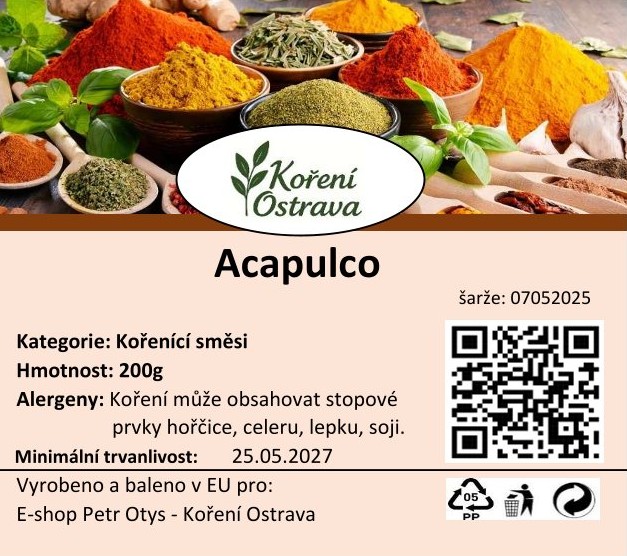 Směs koření Acapulco je inspirovaná mexickou kuchyní a obvykle obsahuje kombinaci výrazných, pikantních a aromatických koření. Konkrétní složení se může lišit podle výrobce.