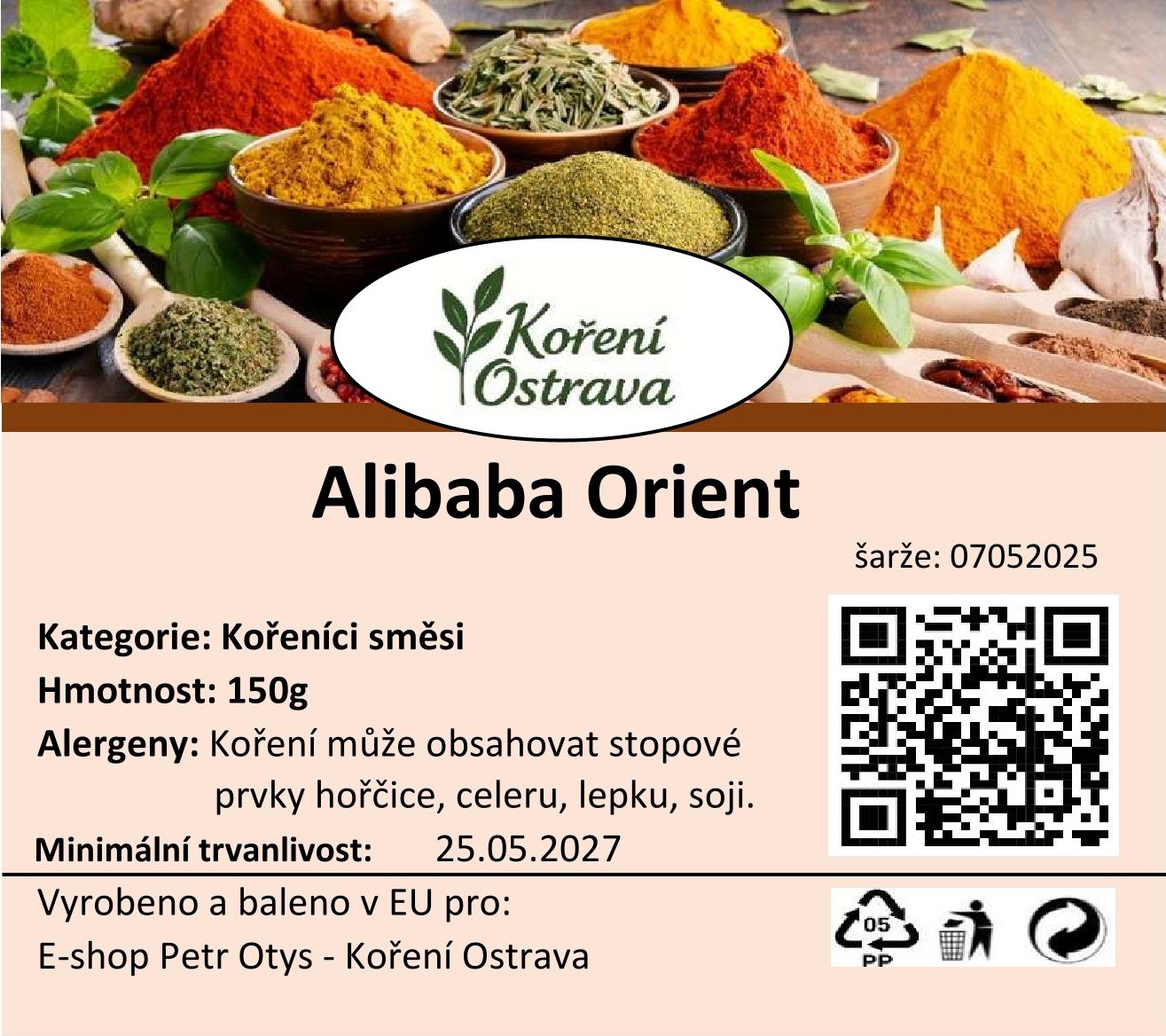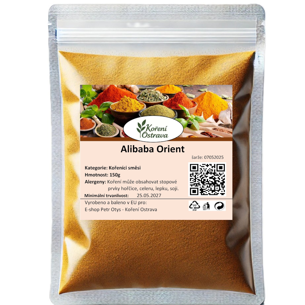 Směs koření Alibaba Orient je směs různých druhů koření, která se používá k dochucení jídel inspirovaných orientální kuchyní. Typicky obsahuje koření jako je skořice, hřebíček, kardamom, zázvor, koriandr, kurkuma, pepř, kmín a další aromatické složky, které dodávají pokrmům výraznou, exotickou chuť. Taková směs se často používá při přípravě pokrmů jako jsou kari, dušená masa, rýže nebo zeleninové pokrmy. Je to směs, která by měla přenést chuť orientálních trhů a typických koření do domácí kuchyně.