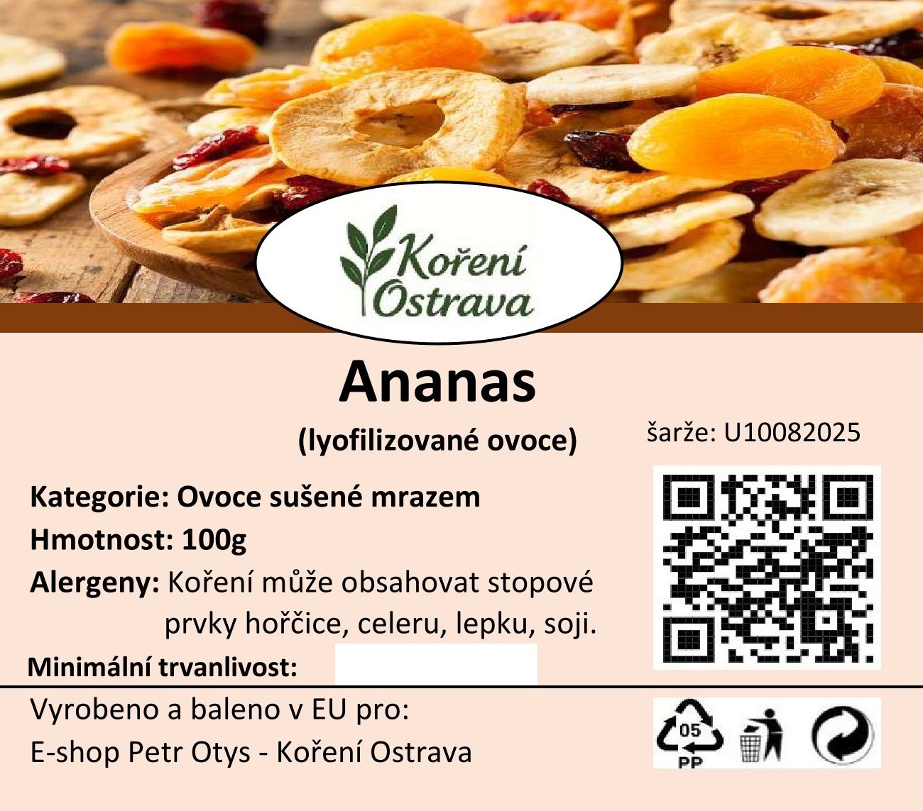 Popis a chuť: Ananas (Ananas comosus) sušený mrazem je zpracován metodou lyofilizace, při níž se z plodů odstraňuje voda při velmi nízkých teplotách. Tento šetrný postup zachovává přirozenou barvu, tvar, vůni, plnou chuť a vysoký obsah vitaminů, minerálů a antioxidantů. Díky tomu je ananas lehký, křupavý a kdykoliv připravený k použití. Skvěle se hodí do snídaňových směsí, dezertů, smoothie nebo jako zdravá svačina na cesty, dodávající jídlům sladkou exotickou chuť a osvěžující aroma.