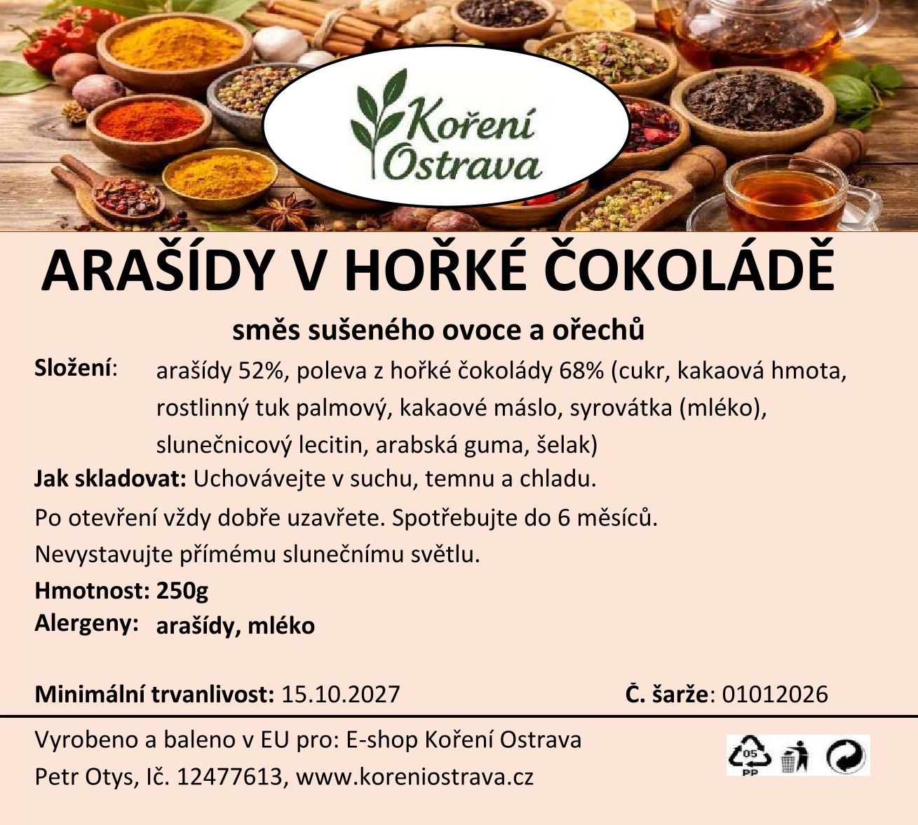 Složení: arašídy 52%, poleva z hořké čokolády 68% (cukr, kakaová hmota, rostlinný tuk palmový, kakaové máslo, syrovátka (mléko), slunečnicový lecitin, arabská guma, šelak)
