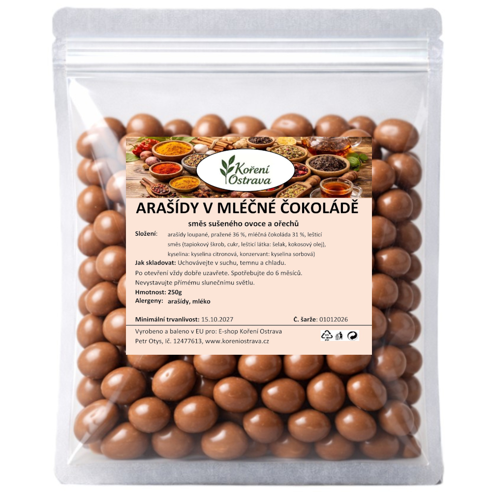Složení: arašídy loupané, pražené 36 %, mléčná čokoláda 31 %, emulgátory: slunečnicový lecitin a polyglycerolpolyricinoleát, přírodní vanilkové aroma, cukr, maltodextrin, kakaový prášek, lešticí směs, kyselina: kyselina citronová, konzervant: kyselina sorbová