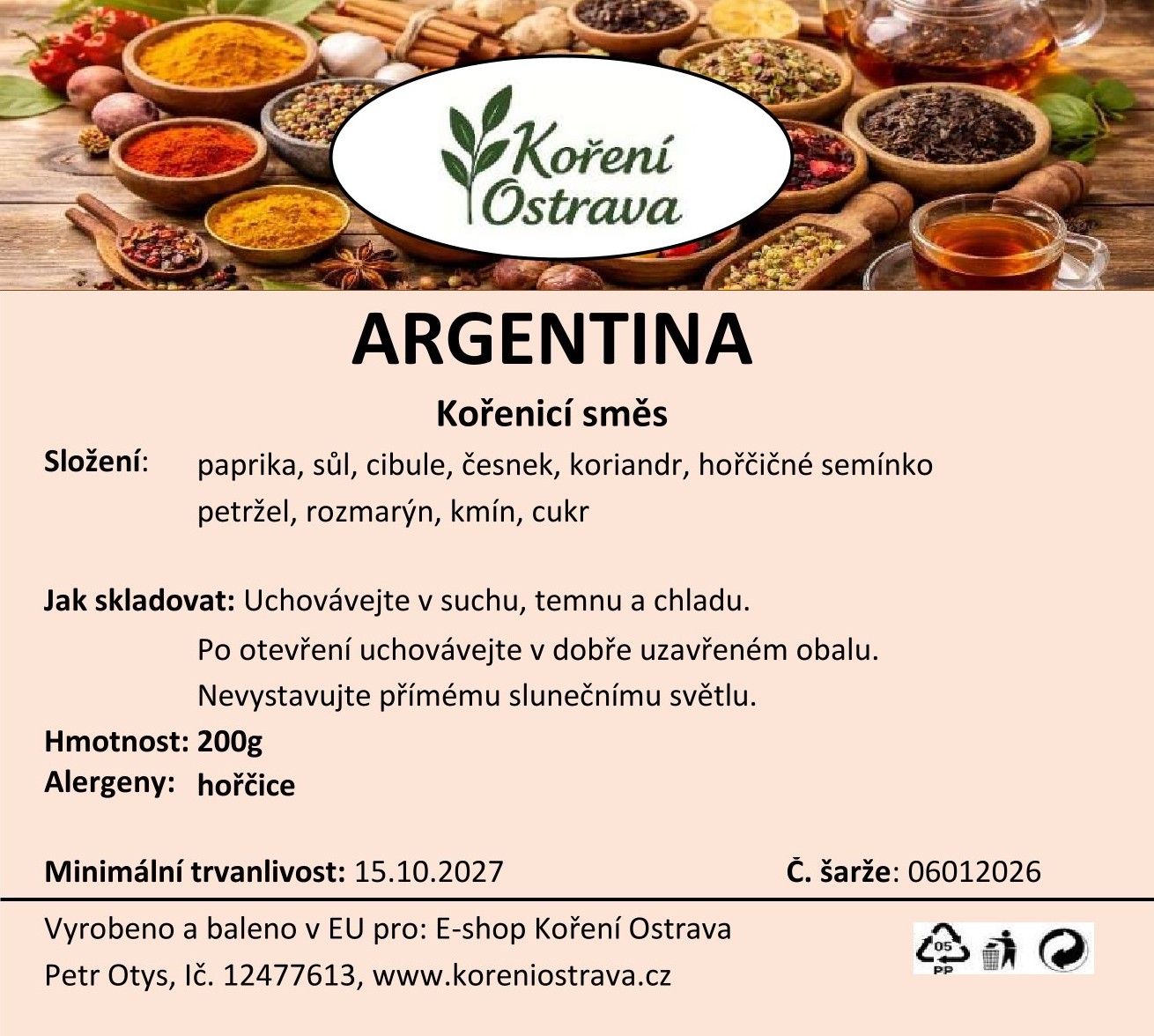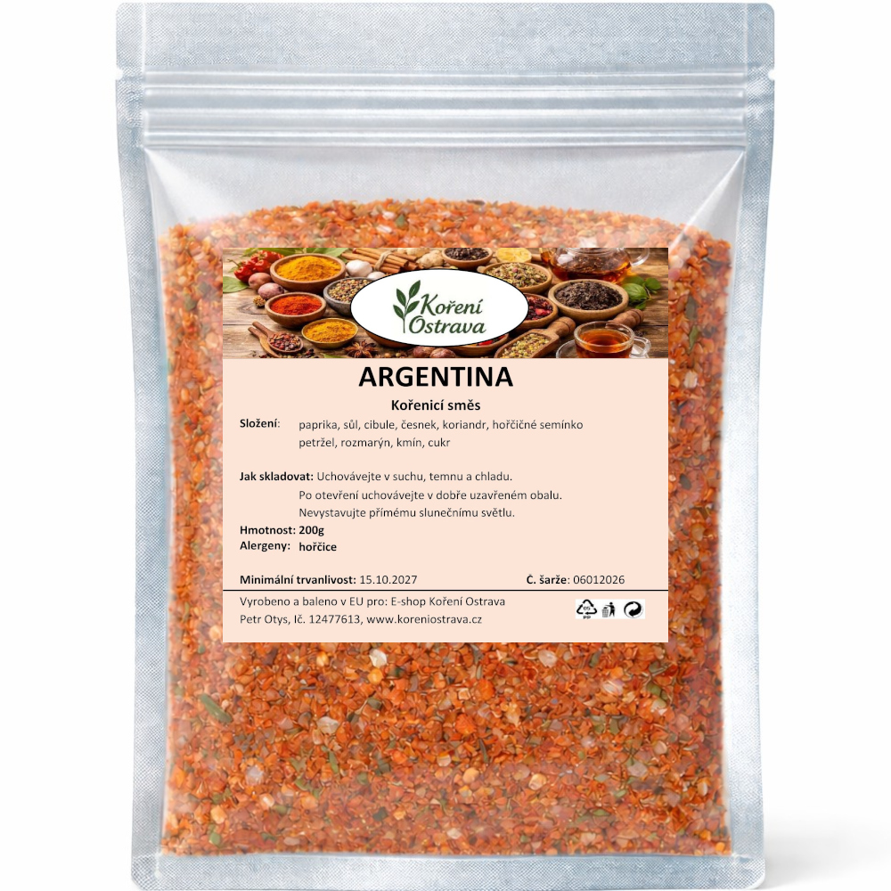 Popis a chuť: Argentina směs je výrazná paprikovo-bylinková kombinace určená především na červené maso, klobásy a zvěřinu. Základ tvoří paprika, česnek a bylinky, které dodají masu plnou chuť, výraznou barvu a lehce pikantní tón. Díky 29% podílu soli směs zároveň částečně nahrazuje samostatné solení.