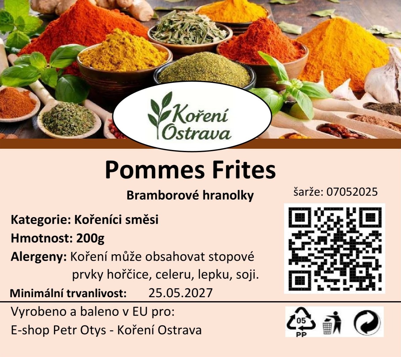 Směs koření Bramborové hranolky je směs, která je určena k dochucení bramborových hranolků a jiných bramborových pokrmů. Obvykle obsahuje různé koření, které podtrhne chuť hranolků a dává jim výraznou a příjemnou chuť. Tato směs je ideální pro rychlé dochucení hranolků před pečením nebo smažením, což je skvélé pro snadné a chutné pokrmy doma.