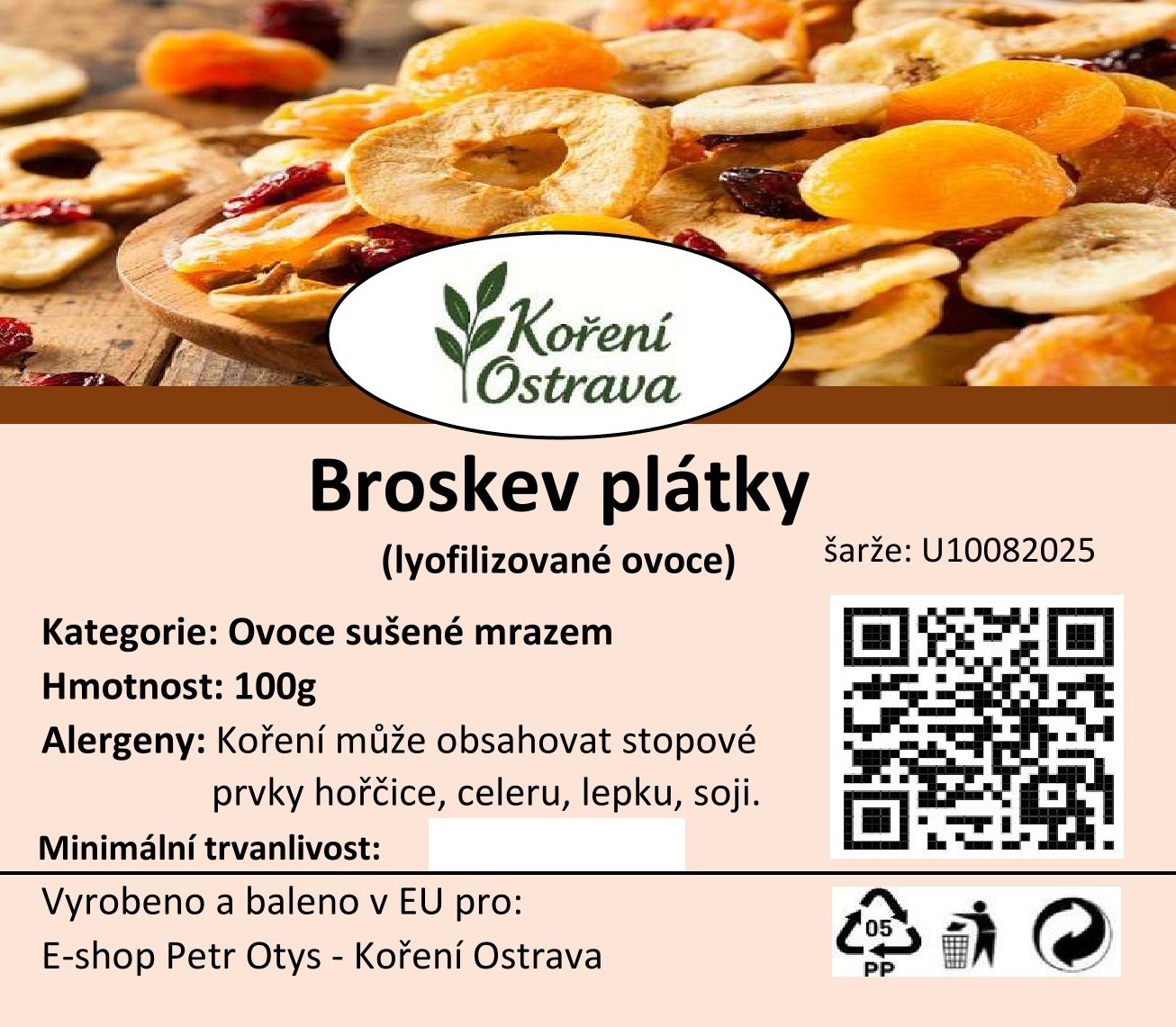 Popis a chuť: Plátky broskví (Prunus persica) sušené mrazem jsou zpracovány šetrnou metodou lyofilizace, při které si zachovávají přirozenou barvu, tvar, sladkou chuť a bohaté aroma. Tento proces probíhá při velmi nízkých teplotách, kdy se z ovoce odstraní voda, aniž by došlo ke ztrátě vitaminů, minerálů a antioxidantů. Díky tomu jsou plátky broskví lehké, křupavé a připravené k okamžité konzumaci. Výborně se hodí do snídaňových směsí, dezertů, smoothie i cukrářských výrobků, kterým dodají jemnou ovocnou chuť a atraktivní vzhled.