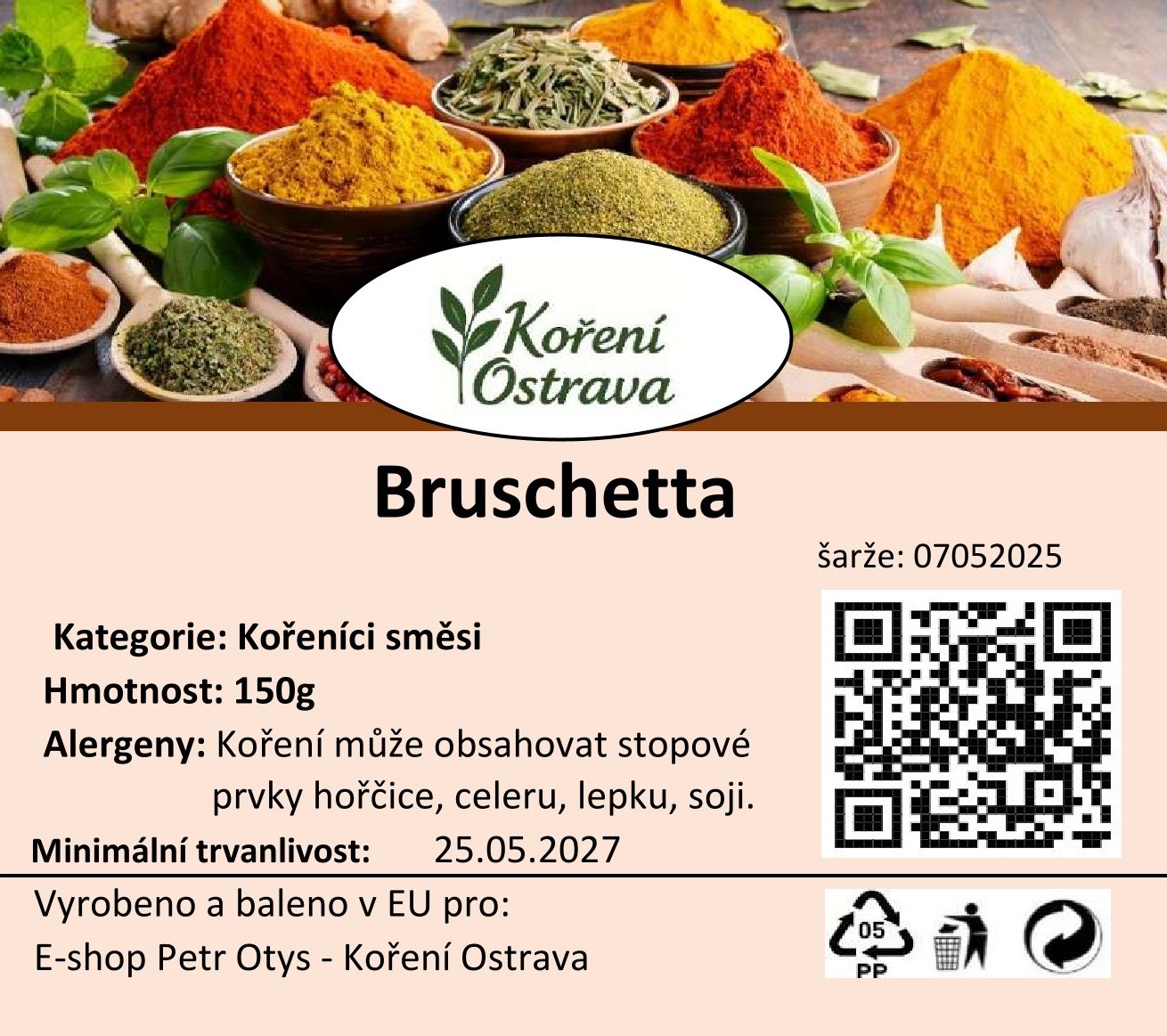 Směs koření Bruschetta je směs bylinek a koření, která se používá především na přípravu tradiční italské bruschetty. Obvykle obsahuje sušený česnek, bazalku, oregano, tymián, rozmarýn a sůl. Může obsahovat i další ingredience, jako je červená paprika nebo cibule, aby podpořila výraznou chuť.