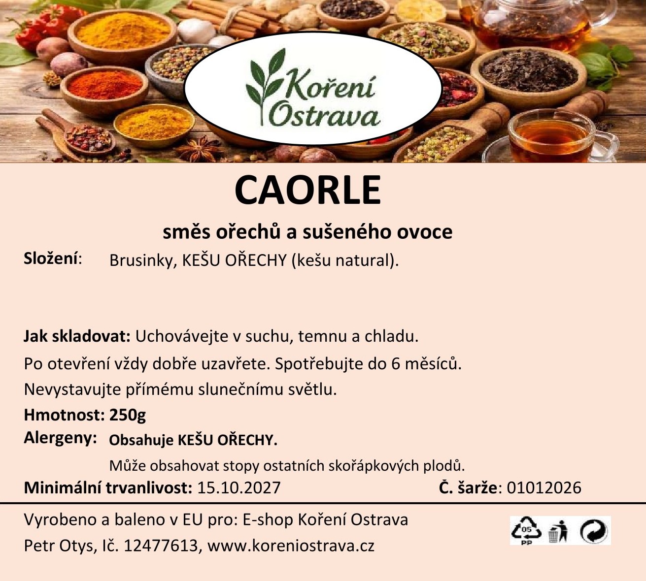 Popis a chuť: Caorle směs je chutěmi bohatá kombinace křupavých ořechů a sladkého sušeného ovoce. Každý sousto nabízí příjemnou harmonii sladkosti šťavnatých brusinek a výrazné, máslové chuti pražených kešu ořechů. Směs působí svěže, dodá energii a přinese kousek středomořské atmosféry do každého dne – ať už jako rychlá svačina, nebo luxusní doplněk ke snídaňovým směsím či dezertům.
