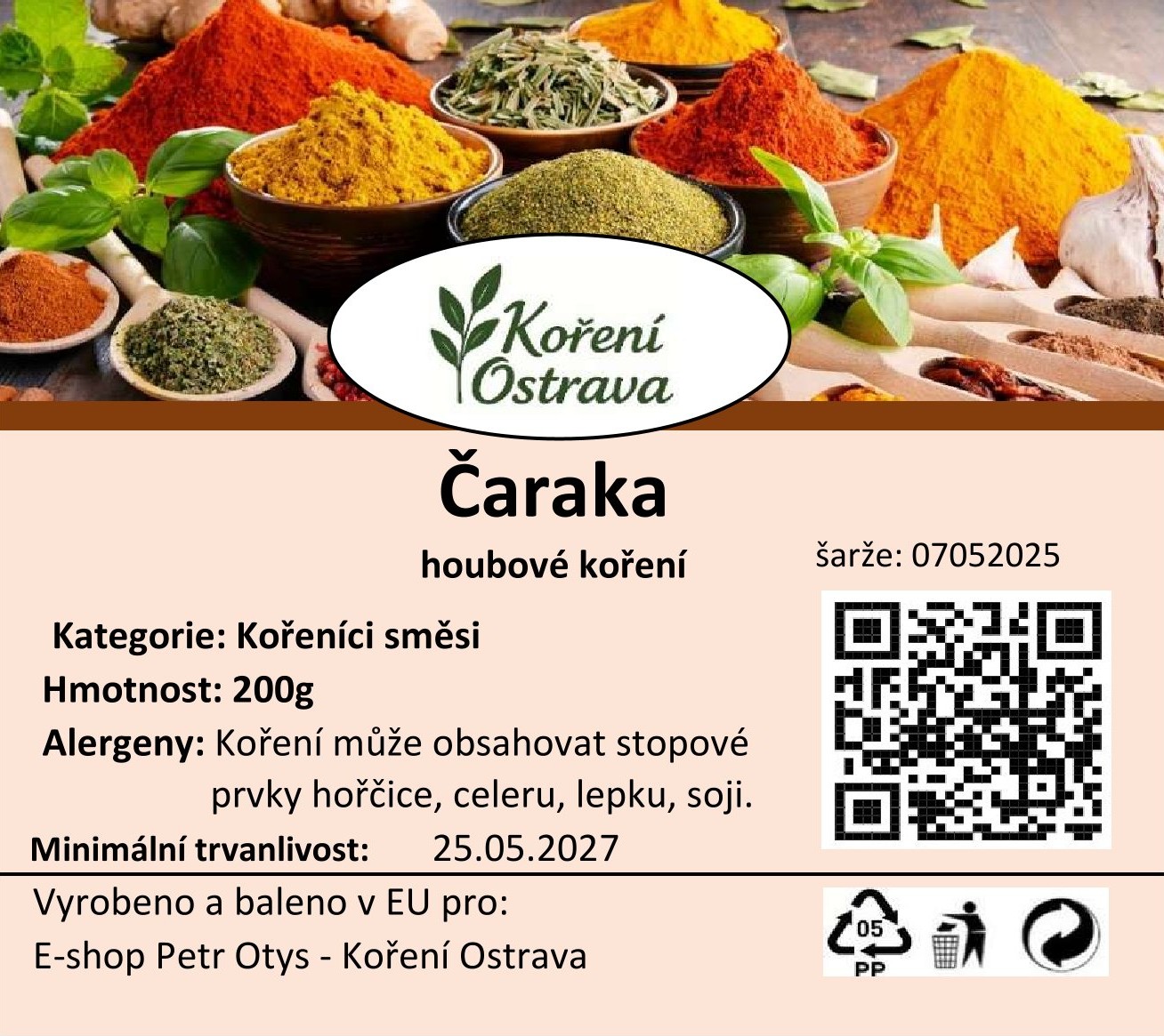 Směs koření Čaraka - houbové koření je speciální kořenící směs, která je určena pro zvýraznění chutí pokrmů, zejména těch, které obsahují houby. Tato směs obvykle obsahuje různé druhy sušených a mletých hub, bylinek a koření, které dodávají pokrmům intenzivní a zemitou chuť připomínající houby.