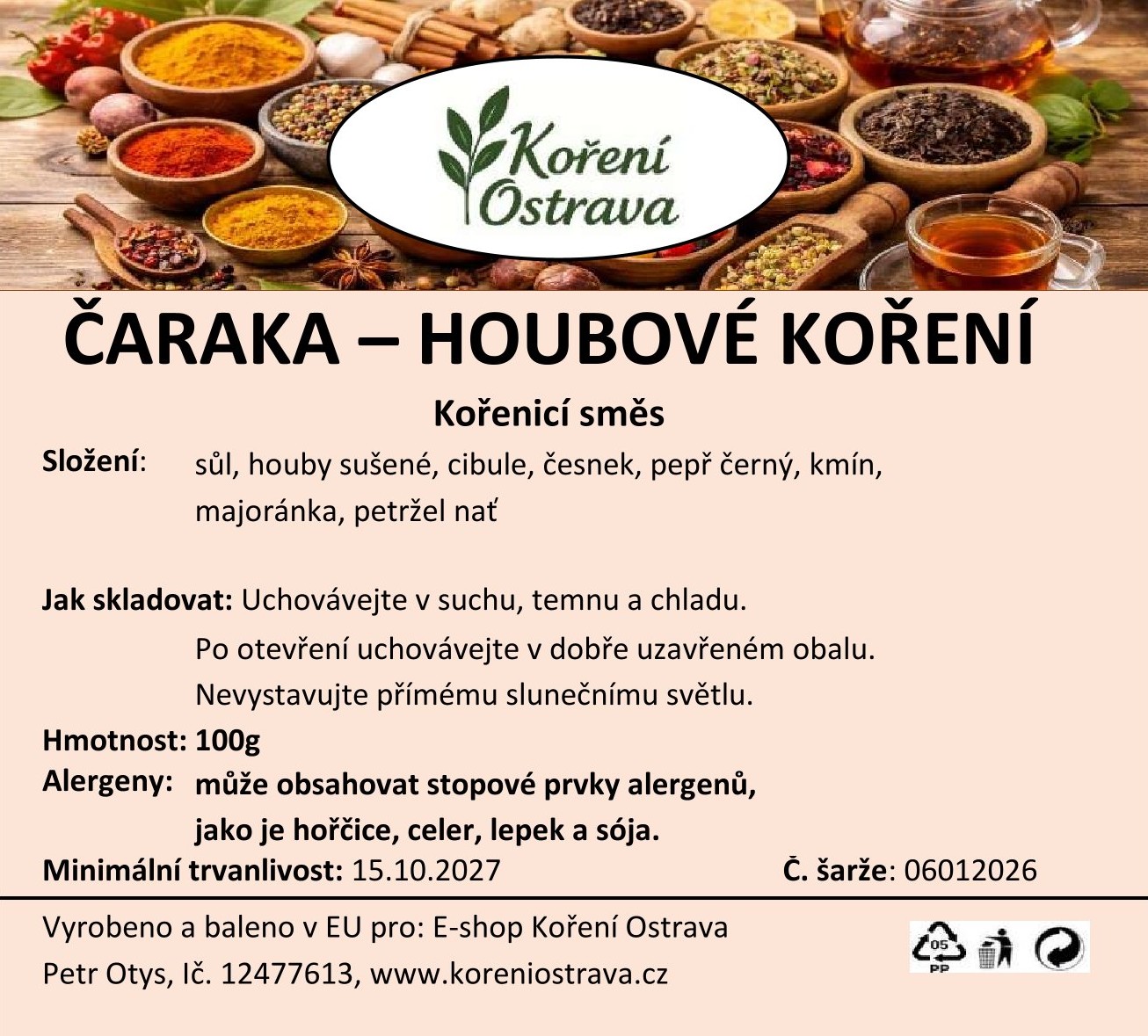 Směs koření Čaraka - houbové koření je speciální kořenící směs, která je určena pro zvýraznění chutí pokrmů, zejména těch, které obsahují houby. Tato směs obvykle obsahuje různé druhy sušených a mletých hub, bylinek a koření, které dodávají pokrmům intenzivní a zemitou chuť připomínající houby.