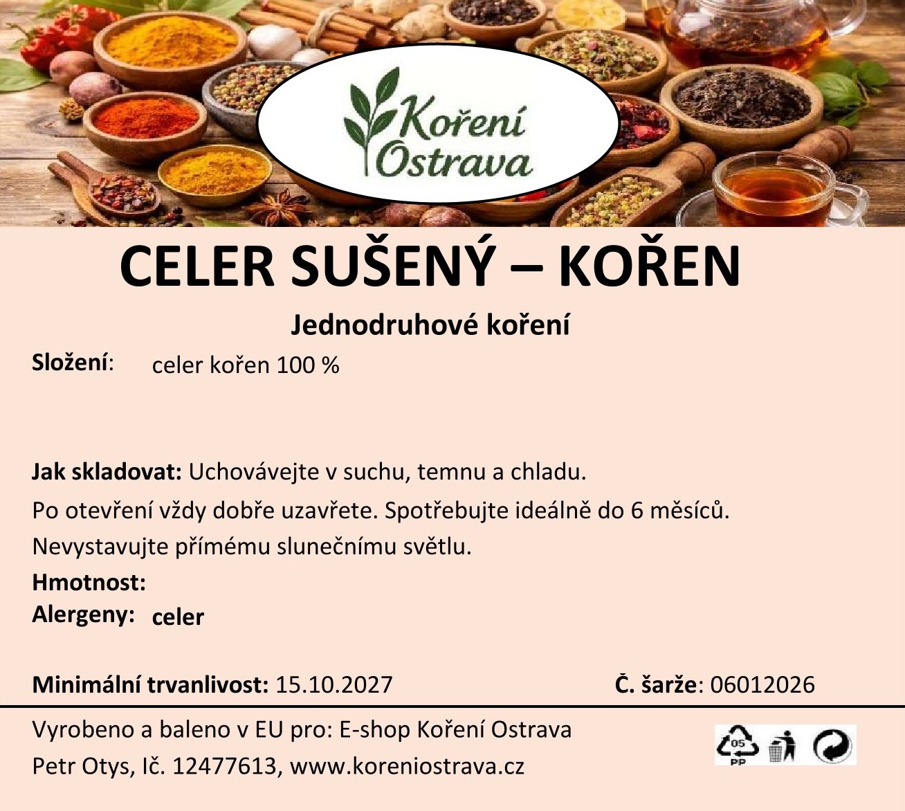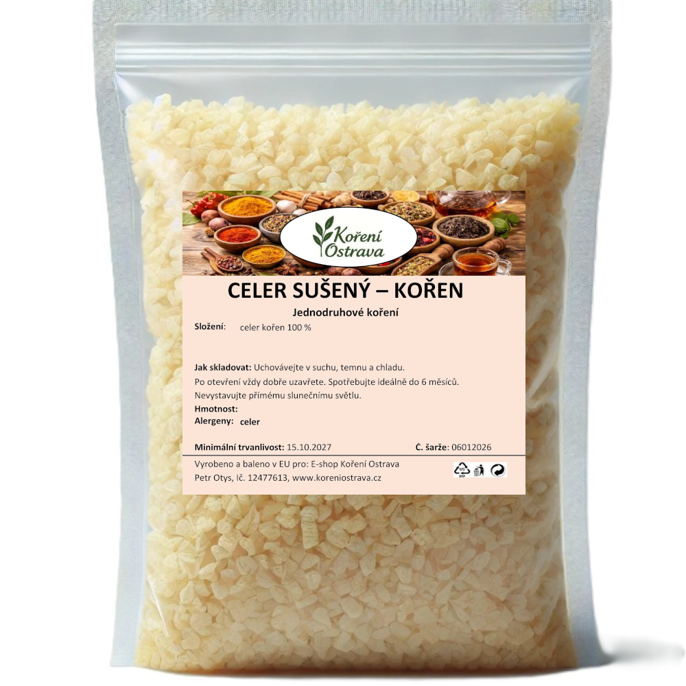 Celer sušený – kořen (Apium graveolens) pochází z pečlivě pěstovaného celeru, který se po sklizni omyje, očistí a šetrně usuší horkým vzduchem bez přídavných látek. Díky tomu si zachovává typické aroma, krémově světlou barvu a bohatou chuť, která se v pokrmech krásně rozvine.