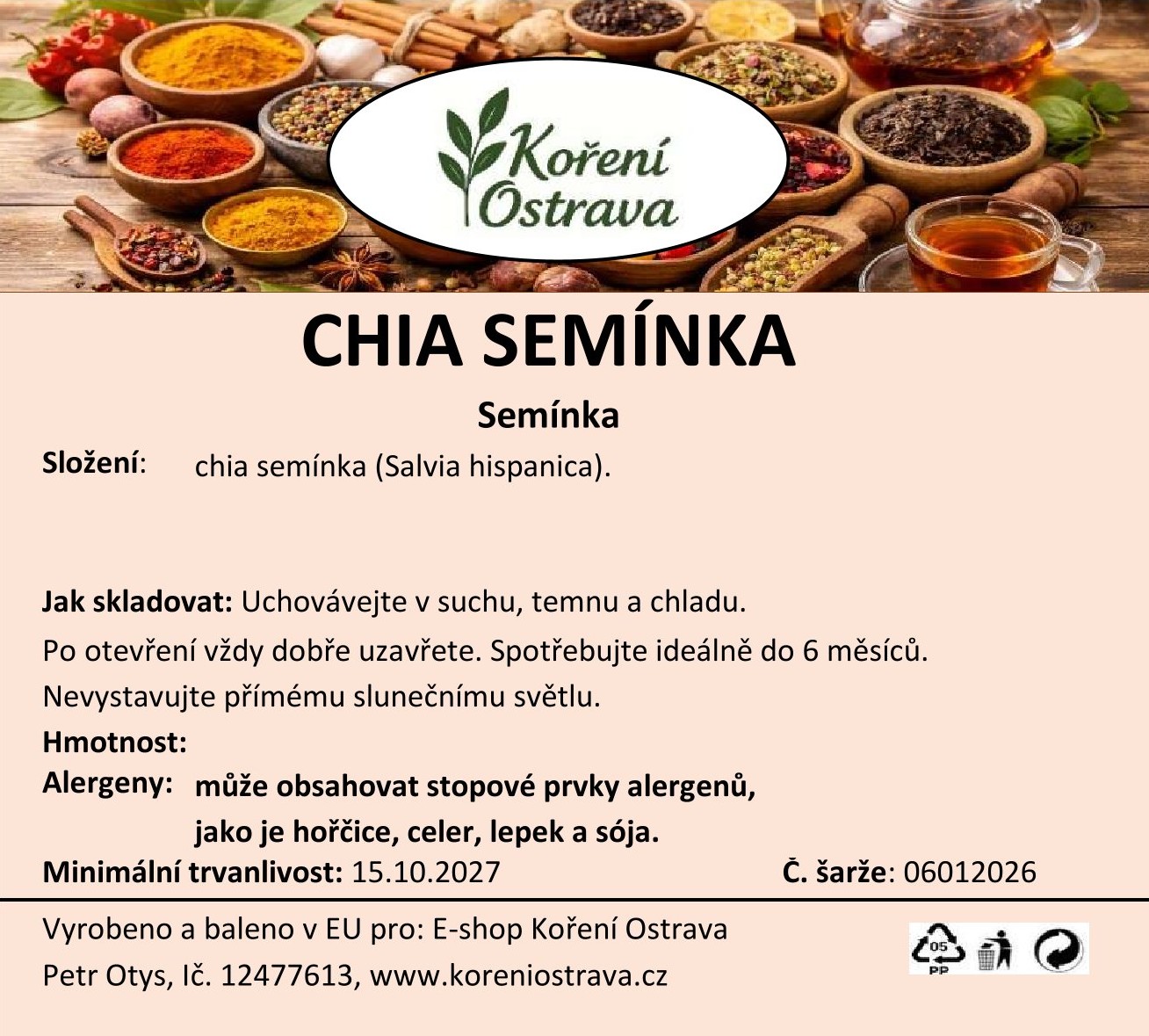 Vyrobeno a baleno v EU pro: E-shop Koření OstravaPetr Otys IČ: 12477613, Mongolská 1529/6,708 00 Ostrava - Poruba