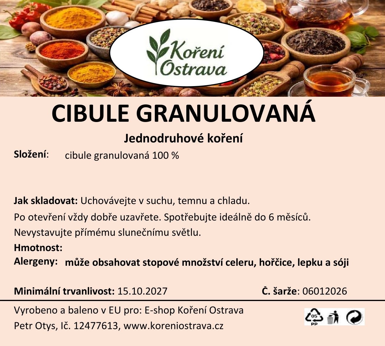 Cibule granulovaná (Allium cepa) je praktická forma sušené cibule, která si díky šetrnému sušení zachovává intenzivní chuť, vůni i přirozenou sladkost čerstvé cibule. Granule se rychle rehydratují, snadno se dávkují a při vaření rovnoměrně uvolňují chuť, což z nich dělá ideální ingredienci pro každodenní vaření.