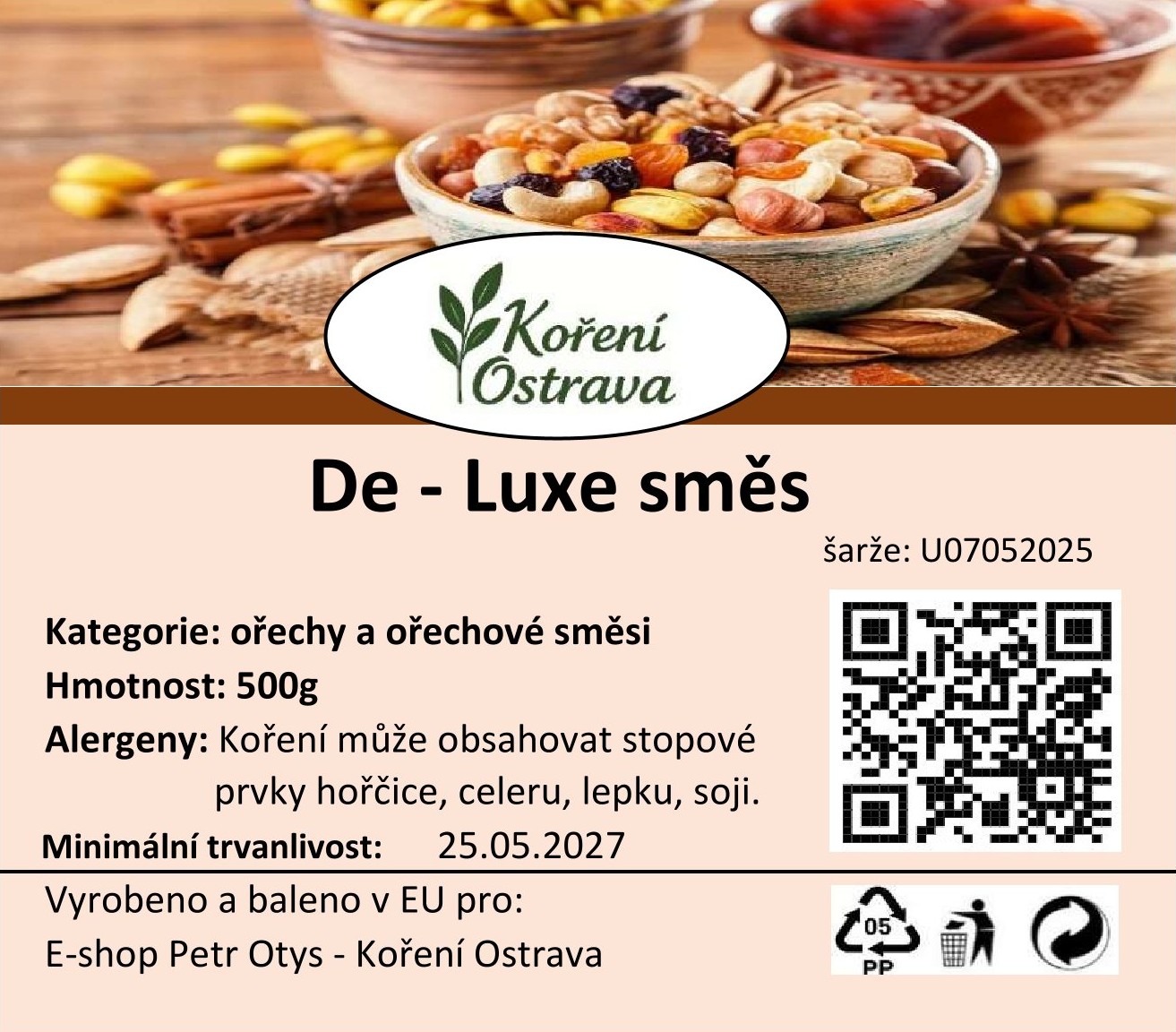Popis a chuť: De-Luxe směs nabízí luxusní zážitek pro všechny, kdo si chtějí dopřát to nejlepší. Bohatá kombinace prémiových ořechů a šťavnatého sušeného ovoce vytváří harmonii chutí, která nadchne každého gurmána. Sladkost rozinek a brusinek perfektně kontrastuje s jemně máslovou chutí kešu, křupavými mandlemi, lískovými a para ořechy či pistáciemi. Směs působí nejen lahodně, ale také elegantně – ideální pro slavnostní příležitosti i každodenní zdravé mlsání.