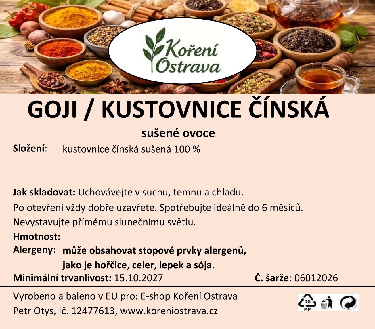 Goji / Kustovnice čínská (Lycium barbarum) je sušené ovoce pocházející z oblastí severní Číny a Mongolska, kde se pěstuje již více než 2000 let. Plody se sbírají ručně v době plné zralosti, kdy mají nejvyšší obsah živin, a následně se suší při nízkých teplotách, aby si zachovaly barvu, chuť a cenné látky.