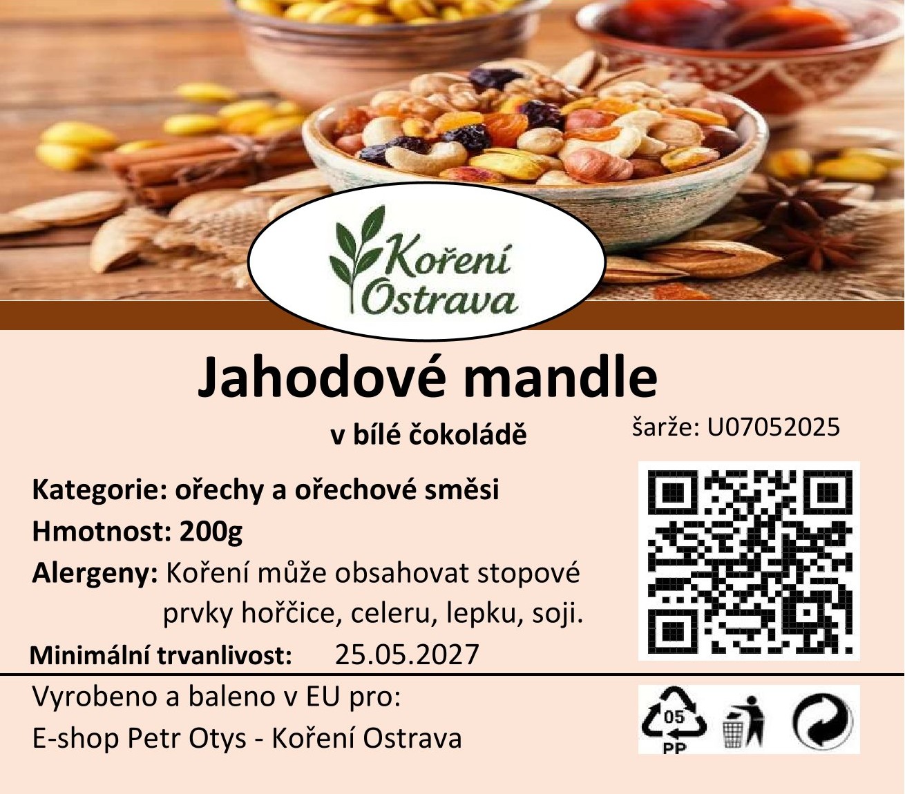 Popis a chuť: Jahodové mandle v bílé čokoládě nabízejí jedinečný chuťový zážitek, který spojuje jemnou sladkost bílé čokolády se svěžím, ovocným tónem jahod. Křupavá textura mandlí dodává každému soustu příjemný kontrast k hladké, krémové polevě. Tato pochoutka je nejen pastvou pro oči díky své růžové barvě, ale především gurmánským potěšením pro chvíle, kdy toužíte po sladkém luxusu. Hodí se jako delikatesa na slavnostní stůl, do dárkových balíčků i na každodenní mlsání.