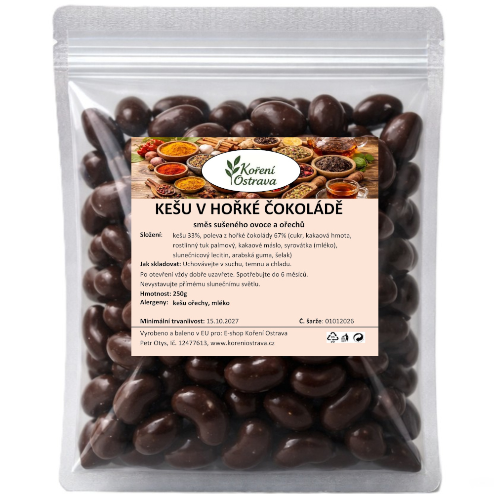 Složení: kešu 33%, poleva z hořké čokolády 67% (cukr, kakaová hmota, rostlinný tuk palmový, kakaové máslo, syrovátka (mléko), slunečnicový lecitin, arabská guma, šelak)