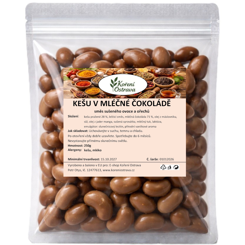 Složení: jádra kešu ořechů 28 %, lešticí směs, mléčná čokoláda 71 %, sušená syrovátka, emulgátory: slunečnicový lecitin, polyglycerolpolyricinoleát, přírodní vanilkové aroma