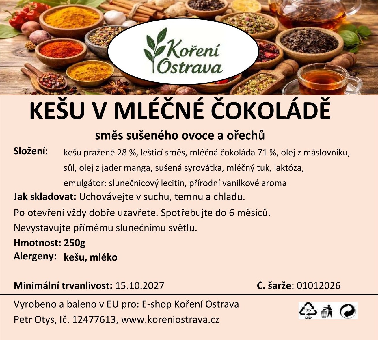Vyrobeno a baleno v EU pro: E-shop Koření OstravaPetr Otys IČ: 12477613, Mongolská 1529/6708 00 Ostrava – Poruba.