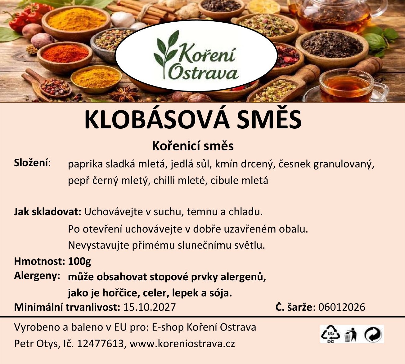 Klobásová směs je tradiční kořenicí směs určená pro přípravu klasických českých i středoevropských klobás. Kombinace papriky, česneku, pepře, kmínu a cibule dodává masu příjemně kořeněnou chuť, jemné aroma a typickou barvu. Na rozdíl od maďarské varianty je tato směs mírnější a vyváženější, s menším důrazem na pálivost a větším podílem soli, která tvoří přibližně 28 % směsi. Sůl zde plní nejen chuťovou, ale i technologickou funkci – podporuje správné prosolení masa, jeho soudržnost a trvanlivost. Pro klasickou výrobu klobás se obvykle používá jedlá sůl nebo dusitanová solící směs (Praganda), která zajišťuje typické vybarvení a lepší uchování masa. Při výrobě se doporučuje dávkování přibližně 18–20 g směsi na 1 kg masa ( 2 polévkové lžíce), bez nutnosti dalšího dosolování. Výsledkem je šťavnatá, výrazná a aromatická klobása s tradiční domácí chutí i vzhledem.