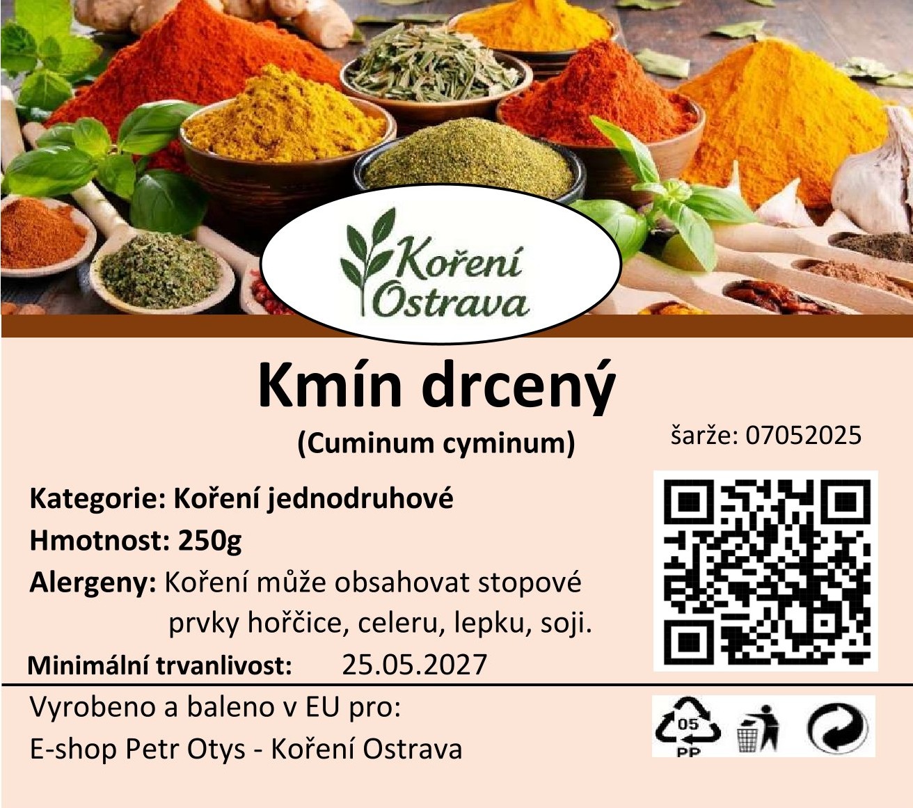 Kmín (Cuminum cyminum) pochází z oblasti Středomoří, dnes se pěstuje po celém světě, zejména v Indii, Egyptě a Střední Asii. Drcený kmín má silnou, kořeněnou a lehce nahořklou chuť a je oblíbený v kuchyních Blízkého východu, Indie a Mexika. Používá se do pečiva, polévek, omáček nebo jako koření do masa.
