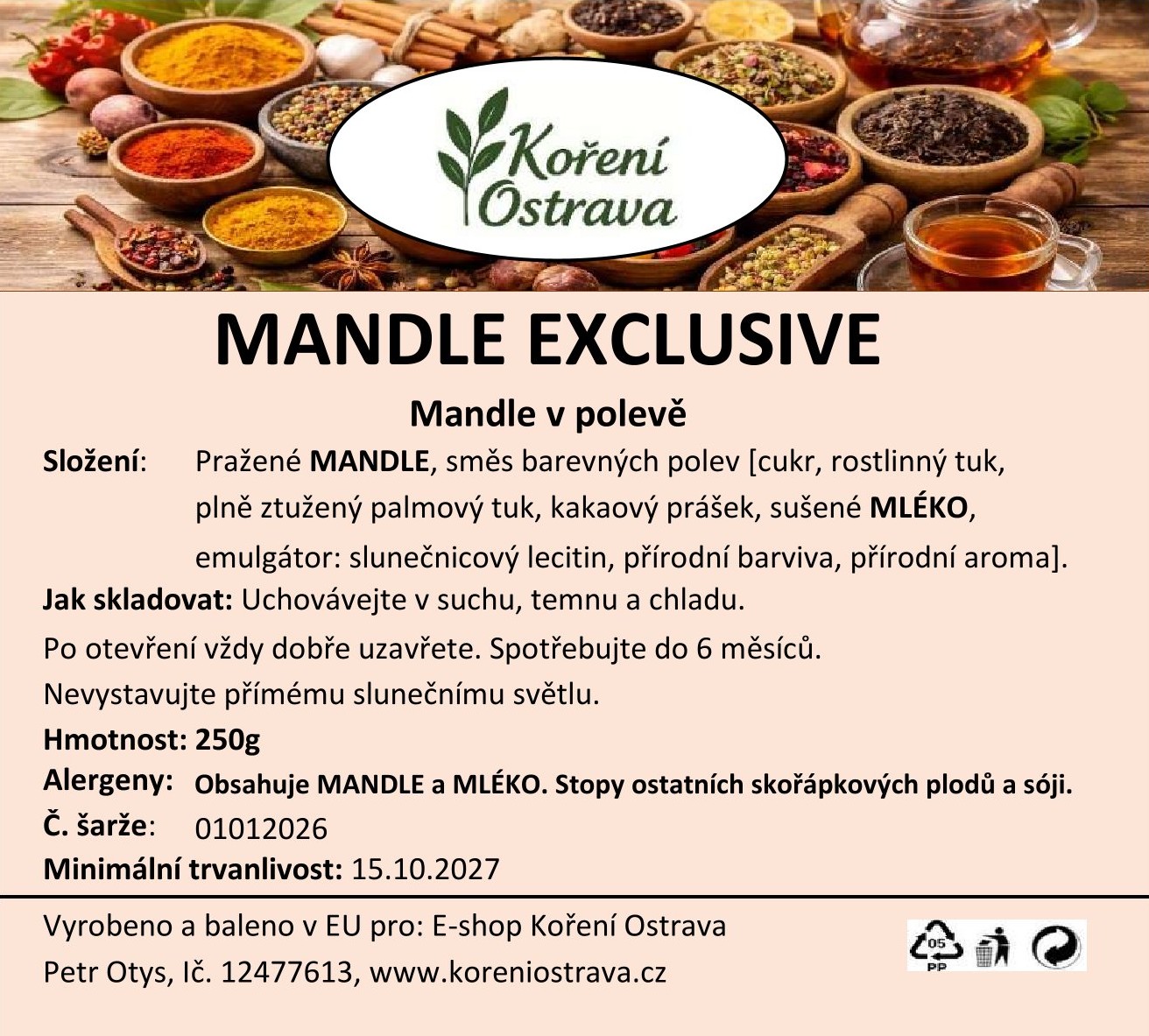 Popis a chuť: Mandle Exclusive jsou exkluzivní směsí ochucených mandlí, které přinášejí bohatou paletu chutí. Od jemně sladké mléčné čokolády, přes krémový karamel, aromatický karob, kávové cappuccino až po exotický kokos, ovocnou jahodovou svěžest a pikantní hořkou čokoládu s chilli. Každé sousto je malým dobrodružstvím, které potěší chuťové pohárky a udělá radost při každém otevření balíčku.