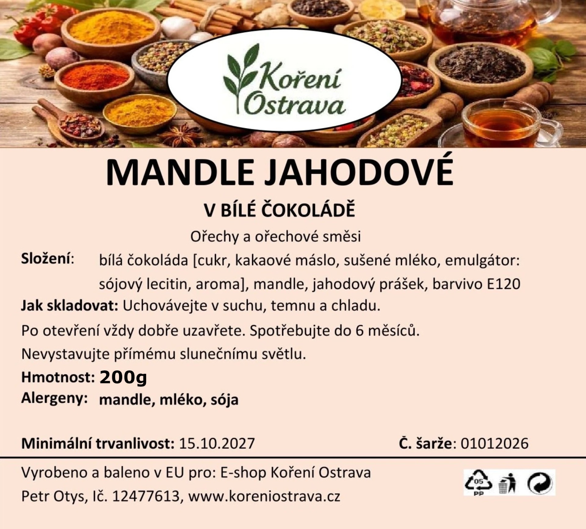 Popis a chuť: Jahodové mandle v bílé čokoládě nabízejí jedinečný chuťový zážitek, který spojuje jemnou sladkost bílé čokolády se svěžím, ovocným tónem jahod. Křupavá textura mandlí dodává každému soustu příjemný kontrast k hladké, krémové polevě. Tato pochoutka je nejen pastvou pro oči díky své růžové barvě, ale především gurmánským potěšením pro chvíle, kdy toužíte po sladkém luxusu. Hodí se jako delikatesa na slavnostní stůl, do dárkových balíčků i na každodenní mlsání.