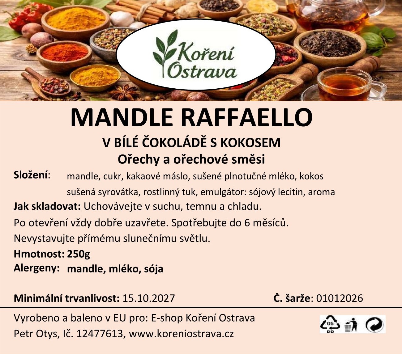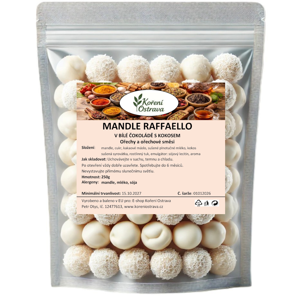 Popis a chuť: Mandle Raffaelo v bílé čokoládě s kokosem jsou sladkou delikatesou, která nabízí jedinečný gurmánský zážitek. Krémová bílá čokoláda obklopuje každé mandlové jádro, které zůstává příjemně máslové a křupavé. Jemně strouhaný kokos dodává celku exotickou vůni i chuť, která připomíná tropické dobroty. Každé sousto je dokonalou harmonií sladkosti, jemnosti a křupavé textury. Ideální pro chvíle, kdy si chceš dopřát něco speciálního, nebo jako luxusní dárek pro milovníky sladkých pochoutek.