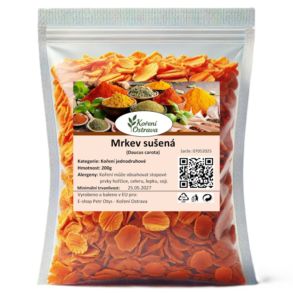 Mrkev (Daucus carota) pochází z oblasti Středního východu a Středomoří. Dnes se pěstuje po celém světě v mírném podnebí. Sušená mrkev má nasládlou, jemnou chuť a používá se jako přísada do polévek, omáček, rizot, směsí koření nebo zeleninových směsí.
