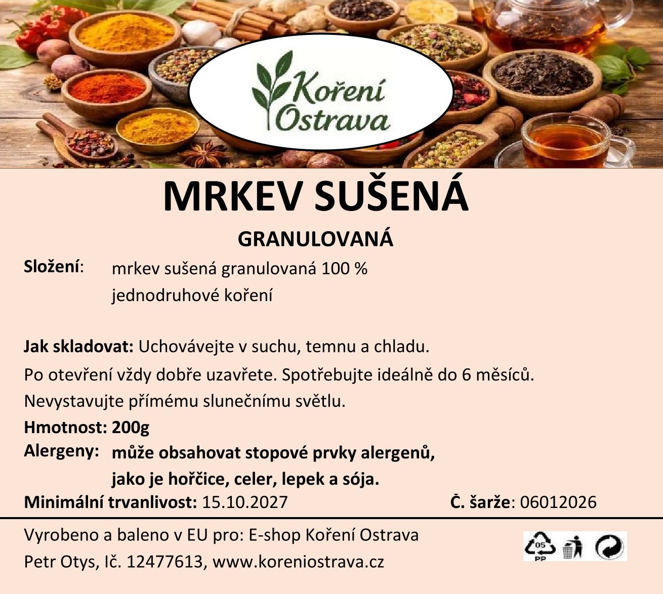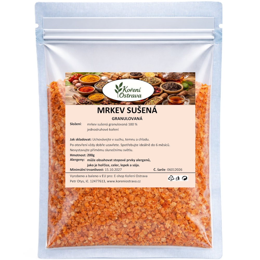 Mrkev (Daucus carota) pochází z oblasti Středního východu a Středomoří. Dnes se pěstuje po celém světě v mírném podnebí. Sušená mrkev má nasládlou, jemnou chuť a používá se jako přísada do polévek, omáček, rizot, směsí koření nebo zeleninových směsí.