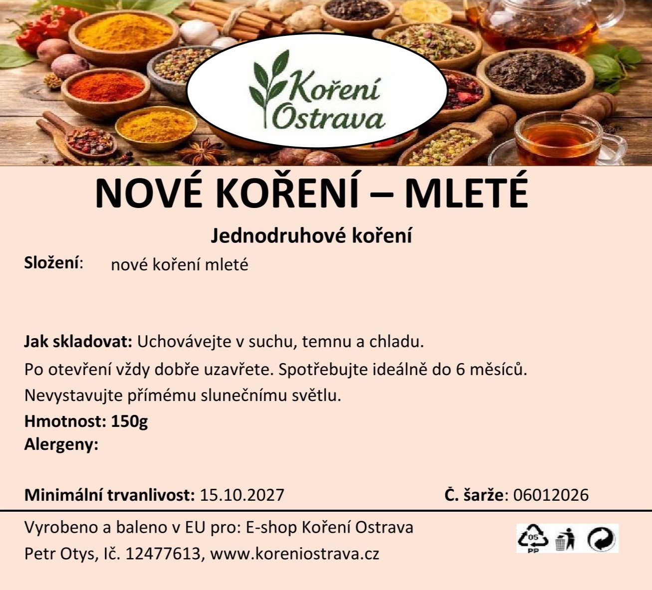 Původ a použití: Nové koření (Pimenta dioica) pochází z tropických oblastí Střední Ameriky a Karibiku. Dnes se pěstuje také v tropických oblastech Jižní Ameriky a Asie. Mleté nové koření má výraznou, kořeněnou, lehce sladkou chuť. Je oblíbené v omáčkách, marinádách, pečených pokrmech, polévkách nebo při přípravě nápojů, jako je punč.