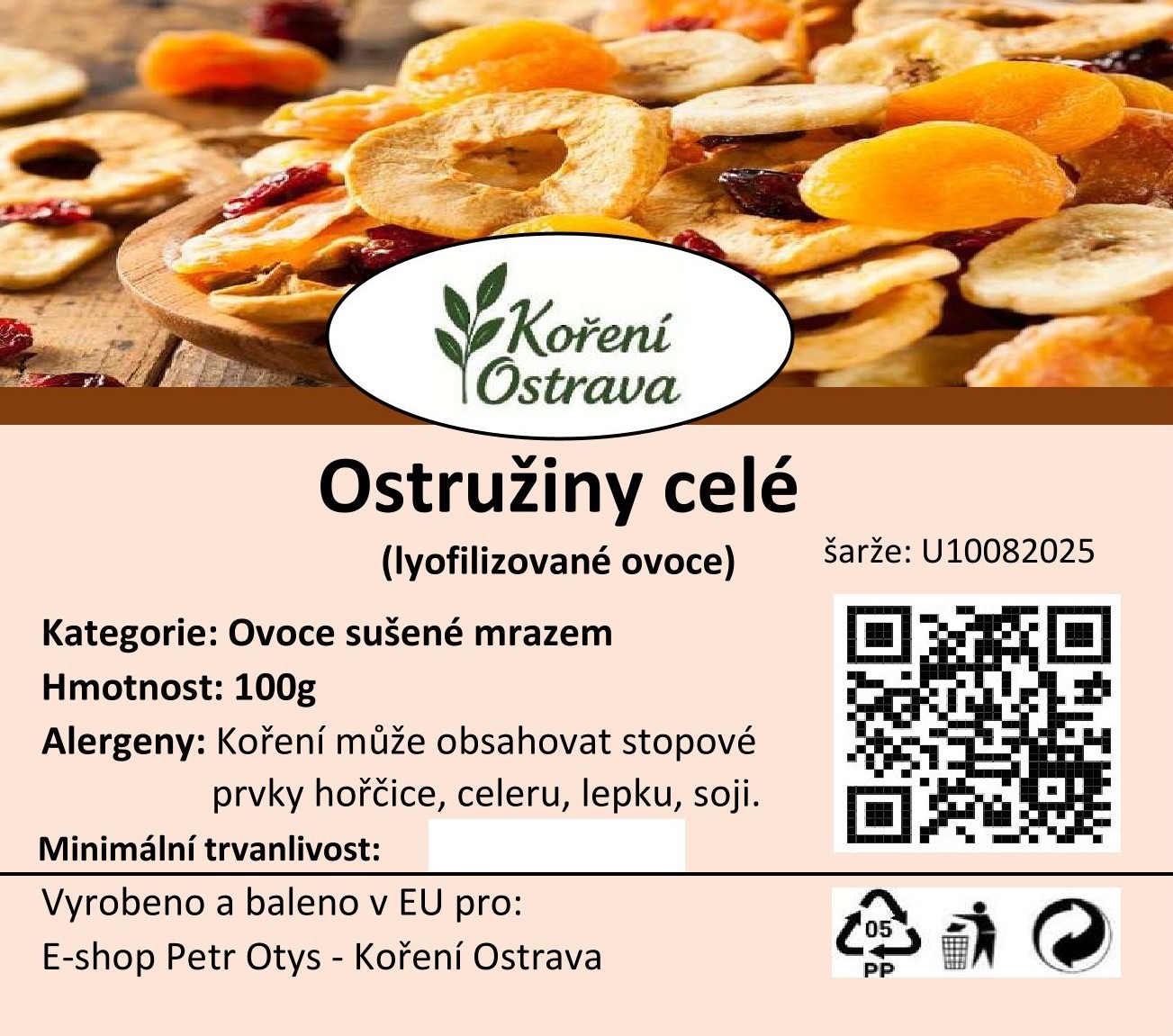 Popis a chuť: Ostružiny (Rubus fruticosus) sušené mrazem jsou zpracovány metodou lyofilizace, která uchovává jejich přirozenou barvu, tvar, intenzivní chuť i vysoký obsah vitaminů, minerálů a antioxidantů. Tento šetrný proces probíhá při velmi nízkých teplotách, kdy se z plodů odstraňuje voda, aniž by došlo ke ztrátě cenných živin. Díky tomu jsou ostružiny lehké, křupavé a kdykoliv připravené k použití. Jejich sladkokyselá chuť s lesním aroma výborně doplní snídaňové směsi, dezerty, pečivo i nápoje a dodá jim svěží ovocný nádech.