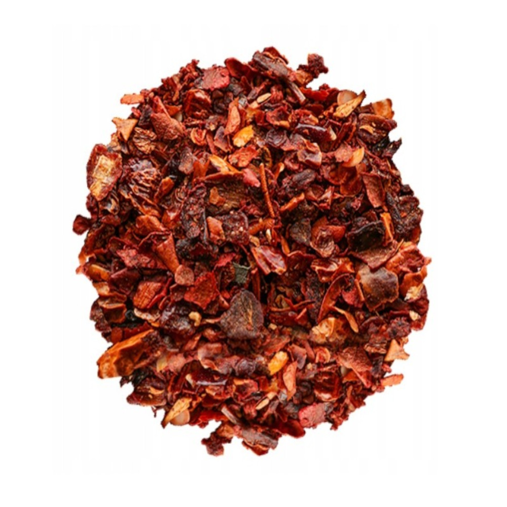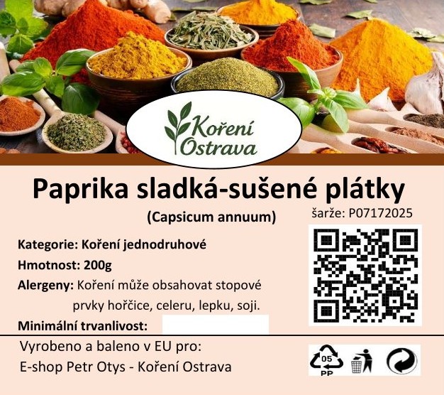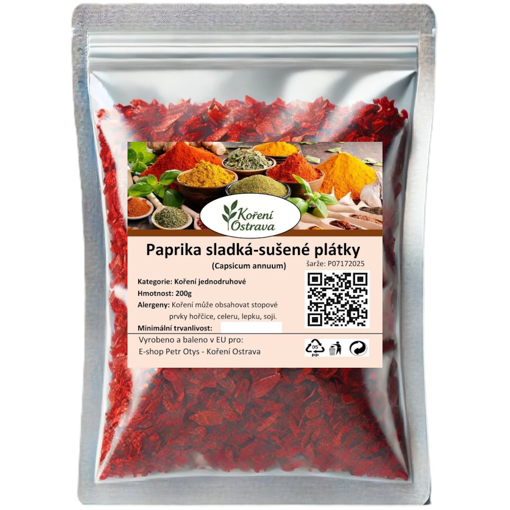 Sladká paprika (Capsicum annuum) pochází z oblasti Střední a Jižní Ameriky, kde byla původně pěstována a používána původními obyvateli. Dnes se pěstuje po celém světě, zejména v Maďarsku, Španělsku a dalších teplých oblastech. Sladká paprika má jemnou, sladkou chuť a je známá svou výraznou červenou barvou. Tahle sušená varianta plátků se používá do omáček, polévek, masových pokrmů, salátů a na dochucení různých jídel.