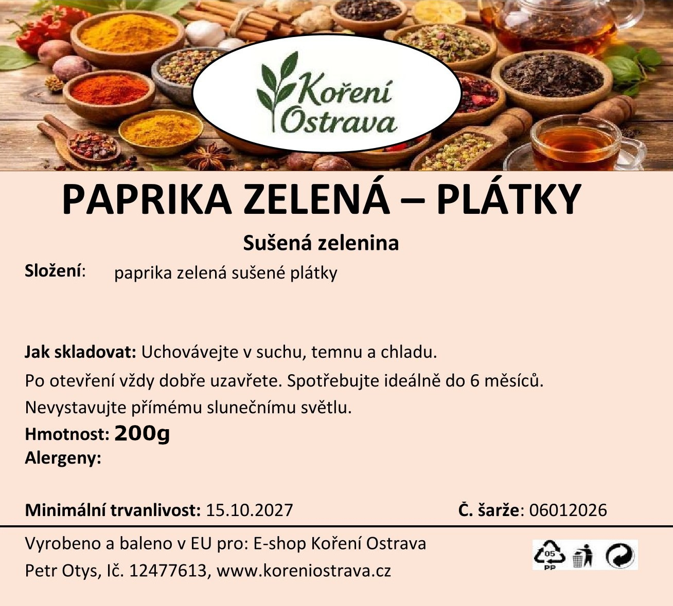 Paprika zelená – plátky (Capsicum annuum) se vyrábí šetrným sušením čerstvých paprik, které se po nakrájení na tenké plátky suší tak, aby si uchovaly svou přirozenou barvu, chuť i aroma. Díky sušené formě mají dlouhou trvanlivost a snadné použití.
