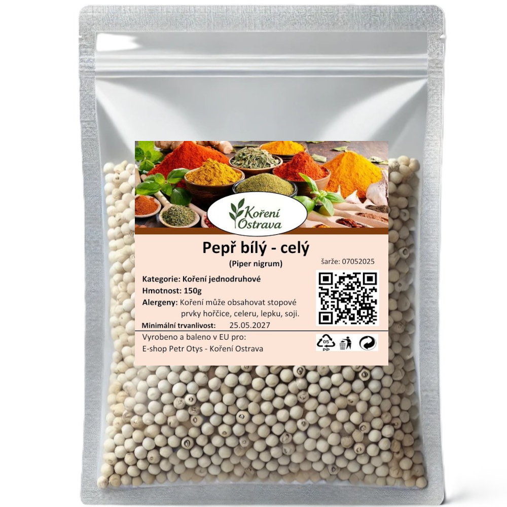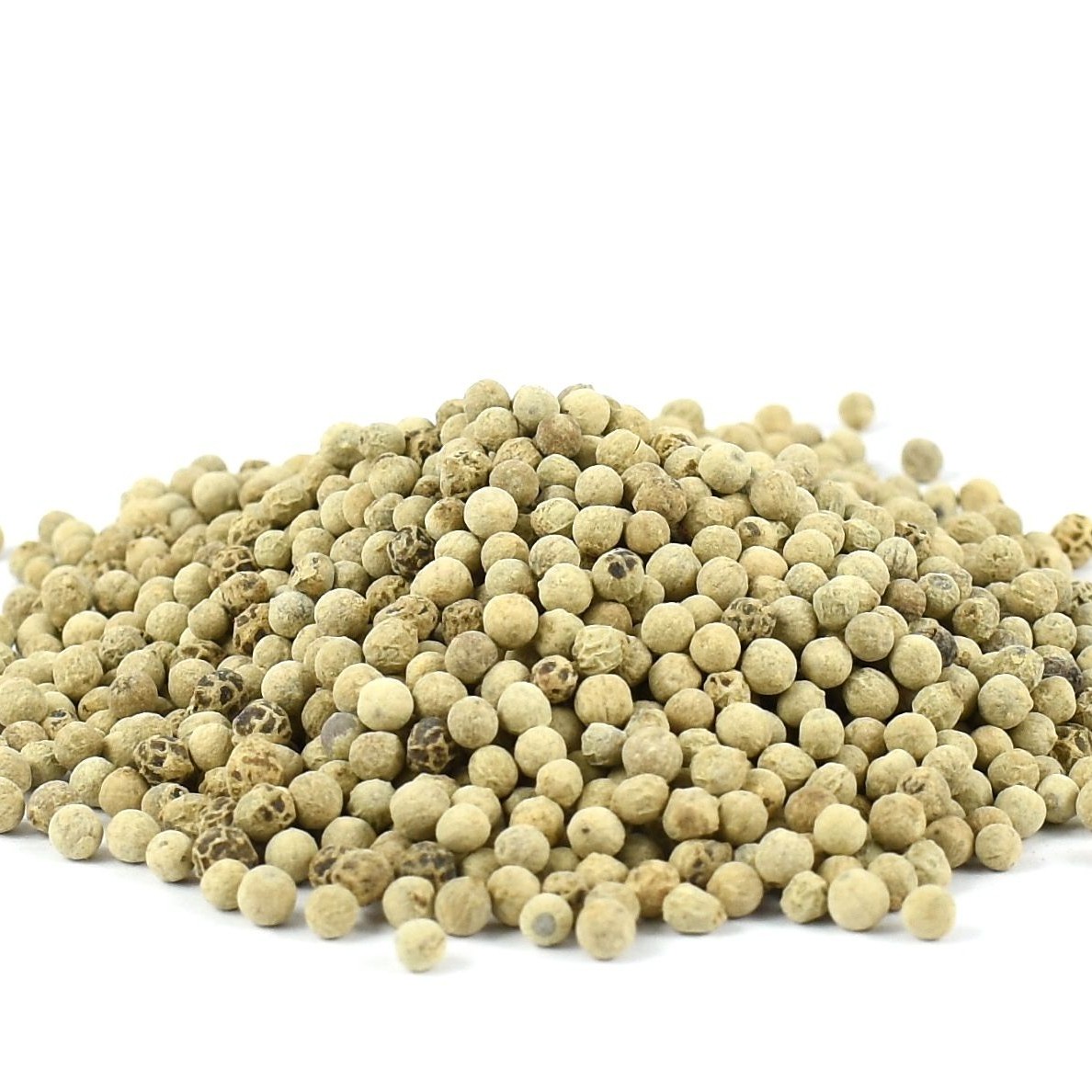 Bílý pepř (Piper nigrum) pochází z tropických oblastí Indie a jihovýchodní Asie. Bílý pepř se získává z plodů pepřovníku, které jsou po sklizni zbaveny slupky, čímž získávají jemnější chuť. Celé kuličky bílého pepře mají pikantní, ale jemnější chuť než černý pepř a používají se v omáčkách, polévkách, rybích a drůbežích pokrmech, kde je žádoucí, aby chuť pepře nebyla příliš dominantní.