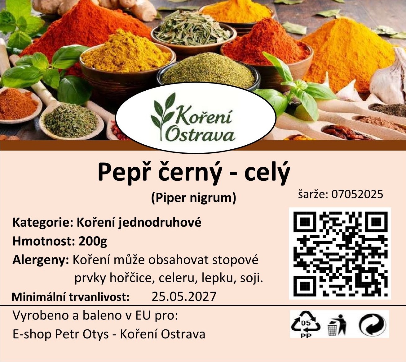 Černý pepř (Piper nigrum) pochází z tropických oblastí Indie a jihovýchodní Asie. Celé kuličky černého pepře se získávají z nezralých plodů pepřovníku, které se suší, čímž získávají charakteristickou černou barvu a intenzivní pálivost. Černý pepř má ostrou, kořeněnou chuť a je základem mnoha pokrmů, od polévek a omáček po maso, ryby a zeleninu.