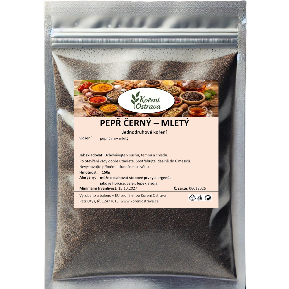 Černý pepř (Piper nigrum) pochází z tropických oblastí Indie a jihovýchodní Asie. Mletý černý pepř je získáván z nezralých plodů pepřovníku, které jsou sušeny a následně mleté na jemný prášek. Má výraznou, pálivou a kořeněnou chuť, která je základem mnoha pokrmů. Používá se do polévek, omáček, masových a zeleninových jídel, salátů nebo jako dochucovadlo k různým pokrmům.