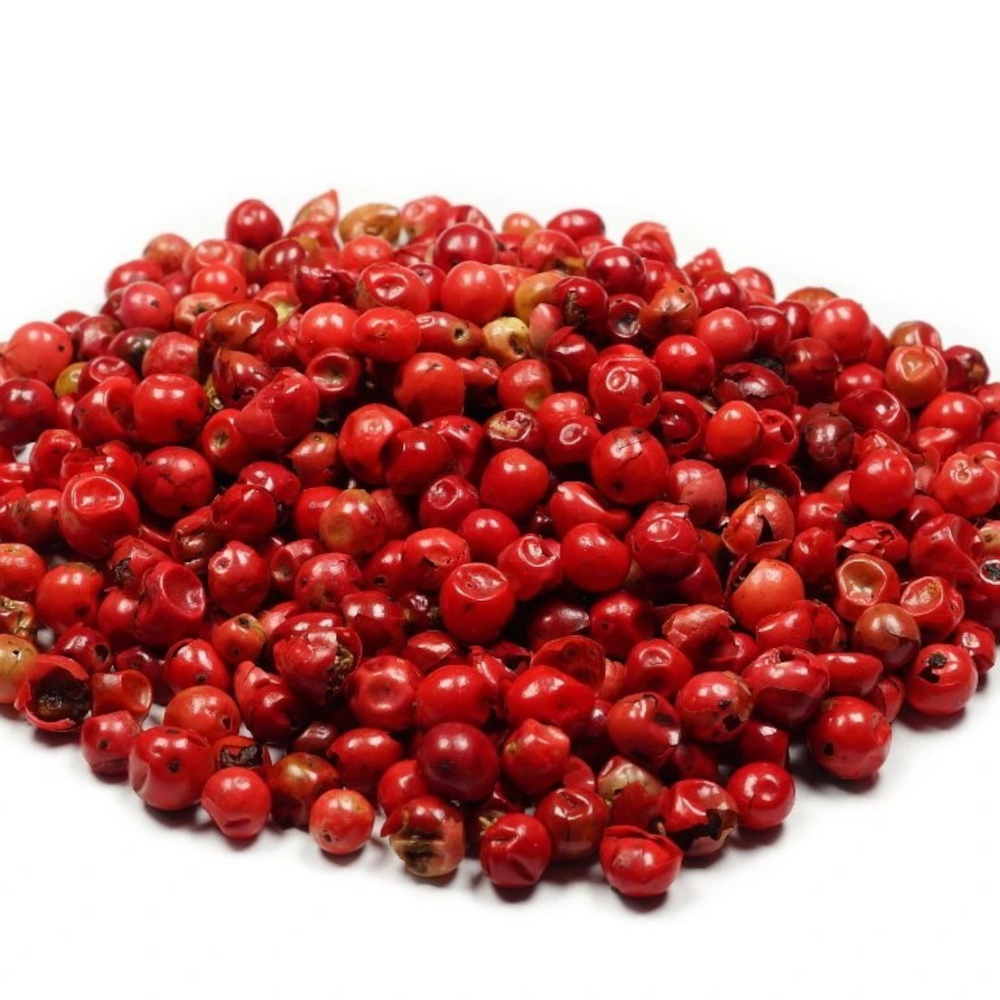 Červený pepř (Piper nigrum) je ve skutečnosti zralý plod pepřovníku, který se sklízí, když je plně dozrálý a má červenou barvu. Tento pepř má jemnější chuť než černý pepř, s ovocnými a sladšími tóny, ale stále si zachovává typickou pálivost. Celé kuličky červeného pepře se používají v pokrmech, kde dodávají výraznou barvu a lehce sladkou pikantnost, ideální do omáček, polévek, salátů a dekorace pokrmů.